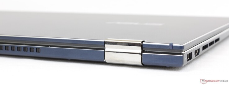 Portalternativen har ändrats avsevärt från den äldre ZenBook Flip 15 UX563FD. Särskilt den integrerade HDMI-porten och de dubbla Thunderbolt 4-portarna är bra att se för att kunna ansluta en mängd tillbehör och externa skärmar. Portplaceringen är dock tveksam, eftersom de två Thunderbolt-portarna och 3,5-ljuduttaget alla är packade väldigt tätt tillsammans längs högerkanten där en extern mus vanligtvis skulle vara. Strömbrytaren ligger också i närheten och det kan därför vara lätt att av misstag sätta den bärbara datorn i vila.