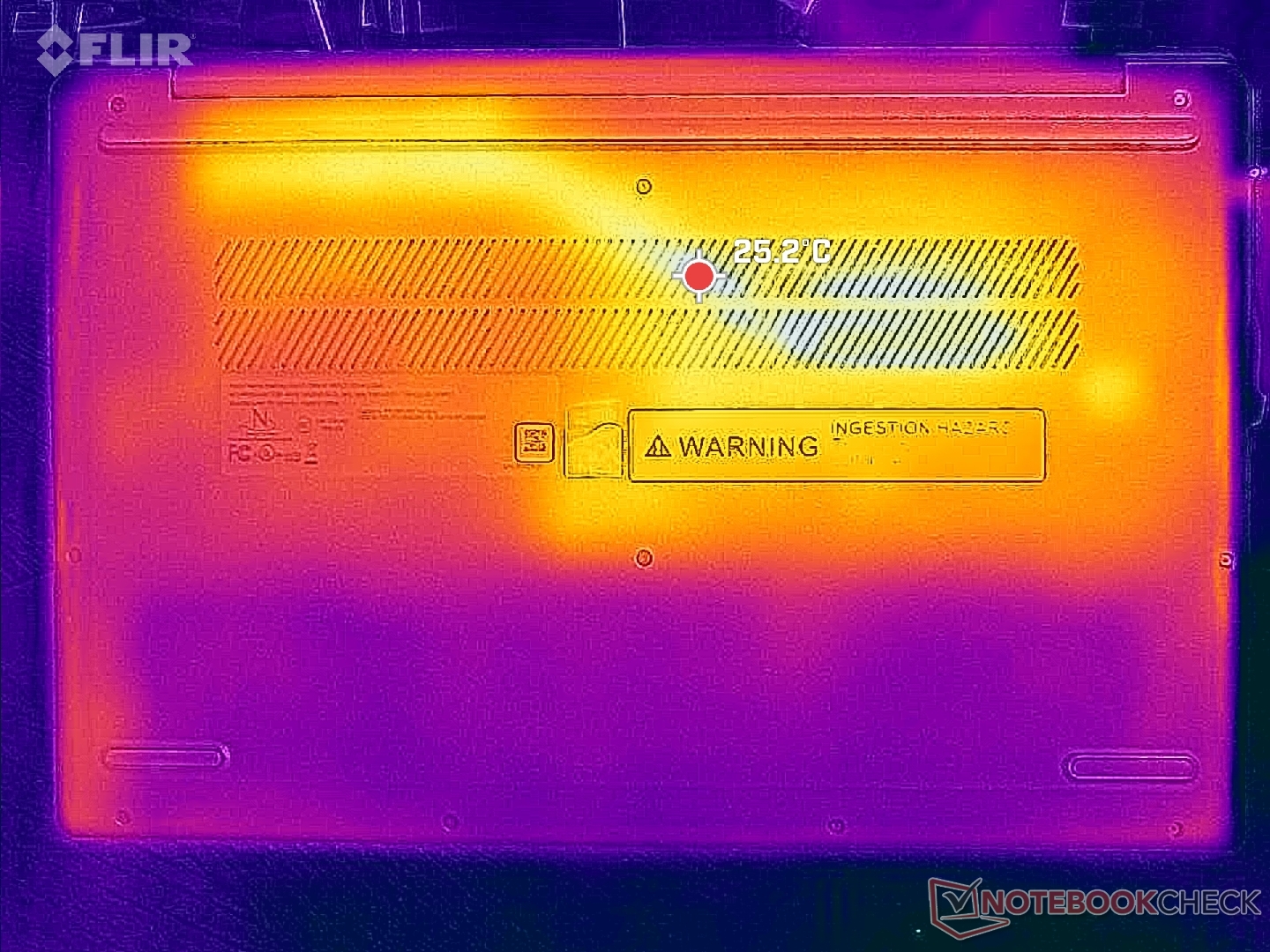 Yttemperaturerna är varmare på den vänstra halvan av chassit än på den högra. Den heta punkten på tangentbordet kan nå 40 C när man kör krävande belastningar, vilket är märkbart men aldrig besvärande i praktiken när man kör mindre krävande uppgifter som webbläsare eller Excel. Alternativ som HP 250 G9 eller Acer Aspire 3 A315 kan bli ännu varmare i genomsnitt, men deras heta punkter är mer mot baksidan där hudkontakten minskar.