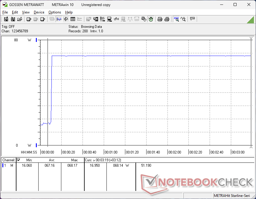 Vi kan registrera ett maximalt uttag på 69 W från den lilla (~ 9,8 x 5,4 x 2 cm) 65 W USB-C AC-adaptern när processorn utnyttjas till 100 procent eller när vi kör spel. Eftersom systemet kan upprätthålla denna hastighet under stress, förvänta dig att laddningshastigheterna stannar om du kör tunga belastningar samtidigt.