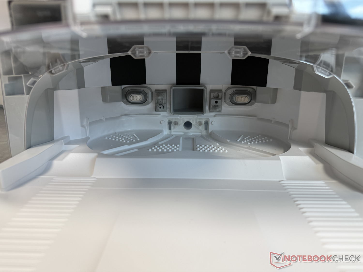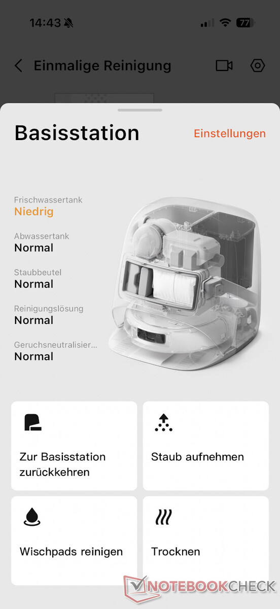 Den självrengörande basstationen ingår också. Enligt tillverkaren utlovar den upp till 200 dagars underhållsfri drift. Detta gäller dock endast för dammuppsugningen i den 2,4 l stora dammpåsen. Färskvattentanken på 4 l och spillvattentanken på 3,2 l kräver mer regelbunden uppmärksamhet. Efter att mopparna har tvättats med varmvatten upp till 60°C och sedan torkats med varmluft, rengör stationens tvättbräda sig själv. Detta fungerade bra i testet.