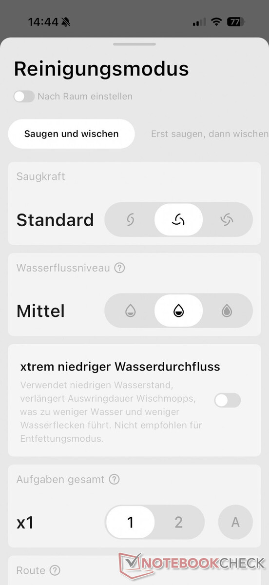 Moppningsprestandan är också bra för en robotdammsugare med två roterande moppar, men inte riktigt på samma nivå som mopprullmodeller som t.ex Dreame Aqua10 Ultra Roller Komplett. Vi måste dock notera att golvet definitivt var blötare vid en medelhög fuktnivå än med andra robotdammsugare med en moppfunktion på jämförbar nivå. Med en firmwareuppdatering för den globala lanseringen förra veckan introducerade DJI ytterligare ett alternativ med ett särskilt lågt vattenflöde, så att det nu finns totalt fyra nivåer att välja mellan.
