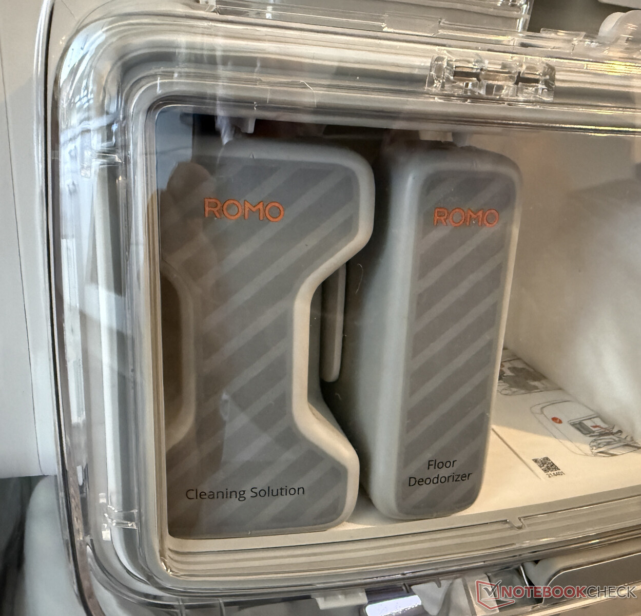 Positivt är att flaggskeppsversionen av DJI Romo har möjlighet att lägga till två olika rengöringsmedel (istället för ett på Romo S och Romo A), vilket kan förbättra rengöringsresultatet och utöka möjligheterna. I leveransomfattningen ingår en rengöringslösning och en exklusiv golvluktborttagare. Dessa kopplas dock direkt in i stationen med sin behållare. Det är därför inte möjligt att fylla på en tank med egna resurser. Istället måste du förlita dig på tillverkarens dyra tillbehör, som kostar 15,99 euro per lösning.