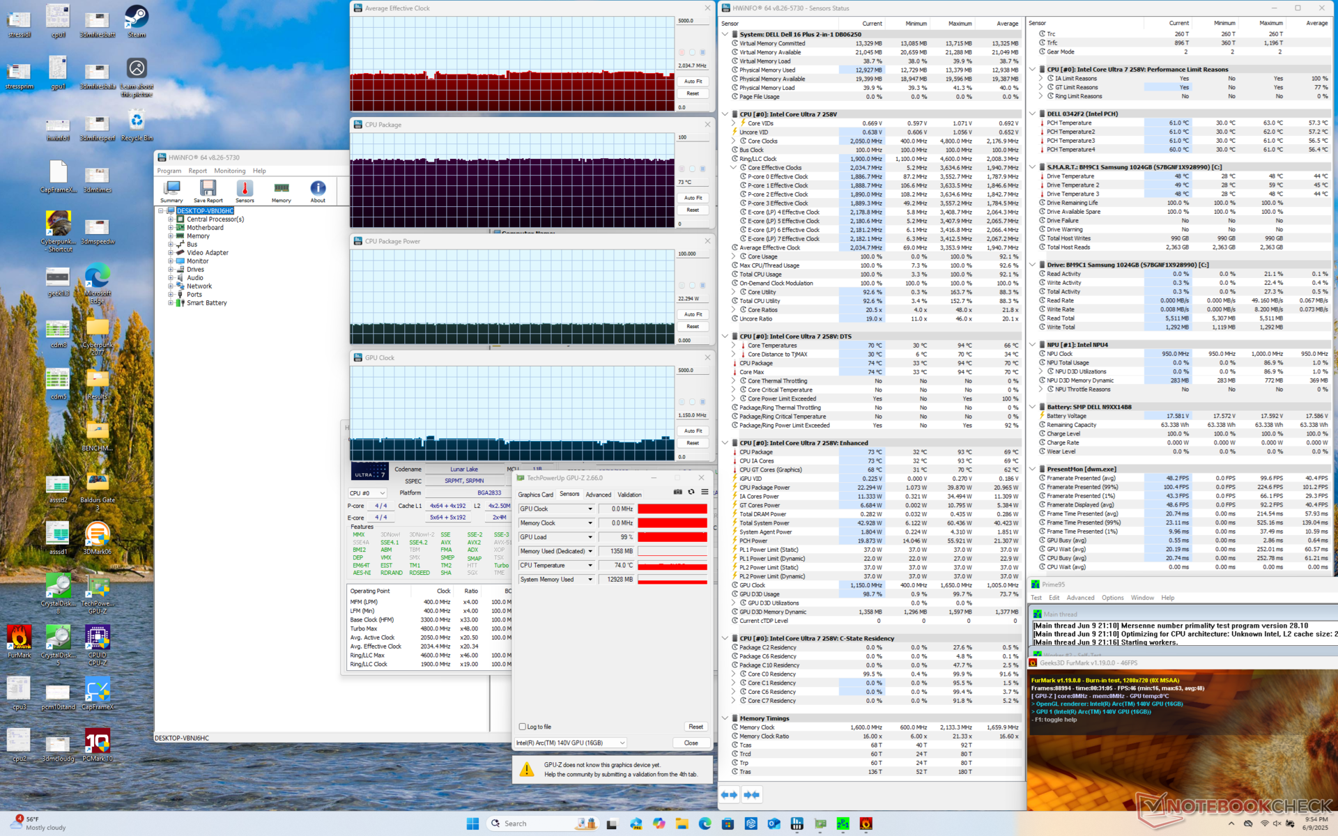 När Prime95-stress initierades ökade processorn till 3,4 GHz och 38 W tills den nådde 93 C flera sekunder senare. Därefter sjönk prestandan till 2,5 GHz och 22 W för att bibehålla en svalare kärntemperatur på 72 C. Detta är nästan 15 C svalare jämfört med Inspiron 16 7640 2-in-1 under liknande förhållanden, men kom ihåg att Dell 16 Plus 2-in-1 också levereras med en långsammare processor.