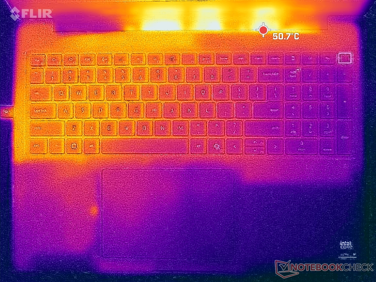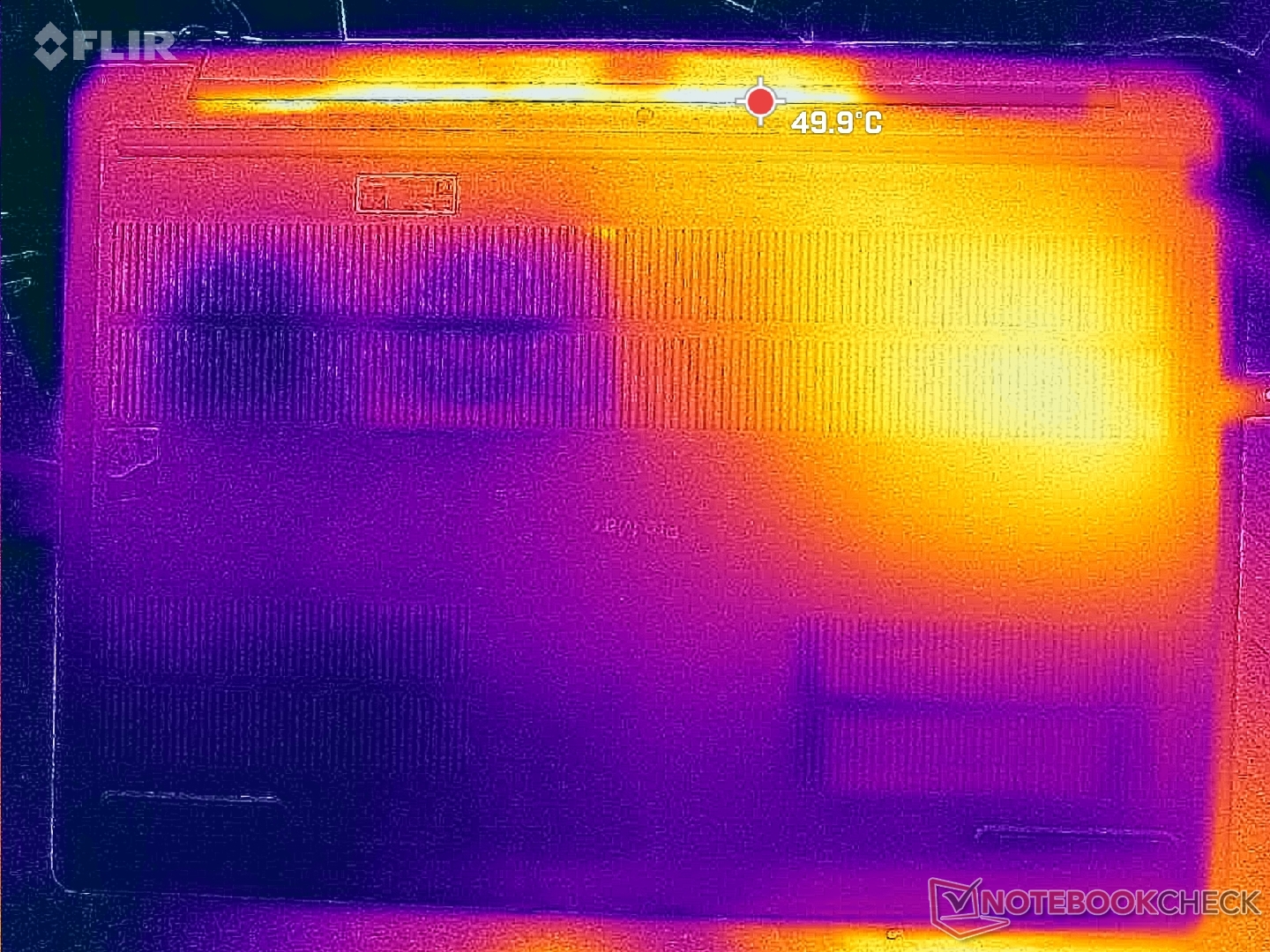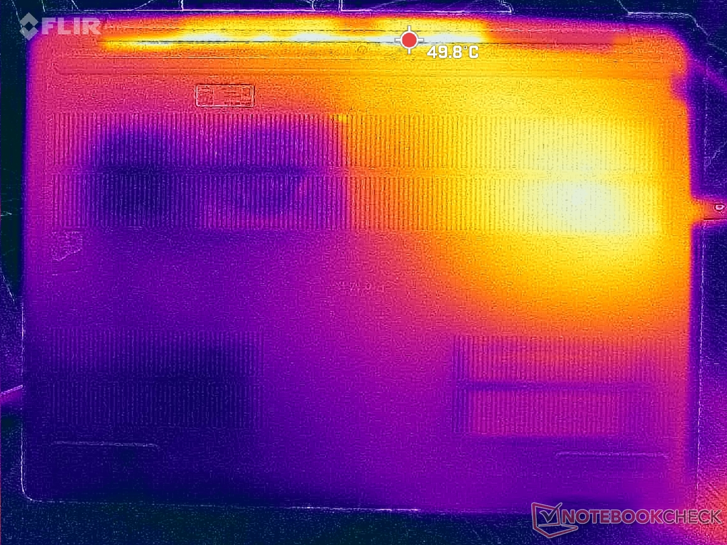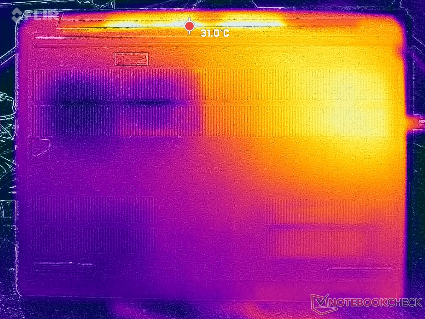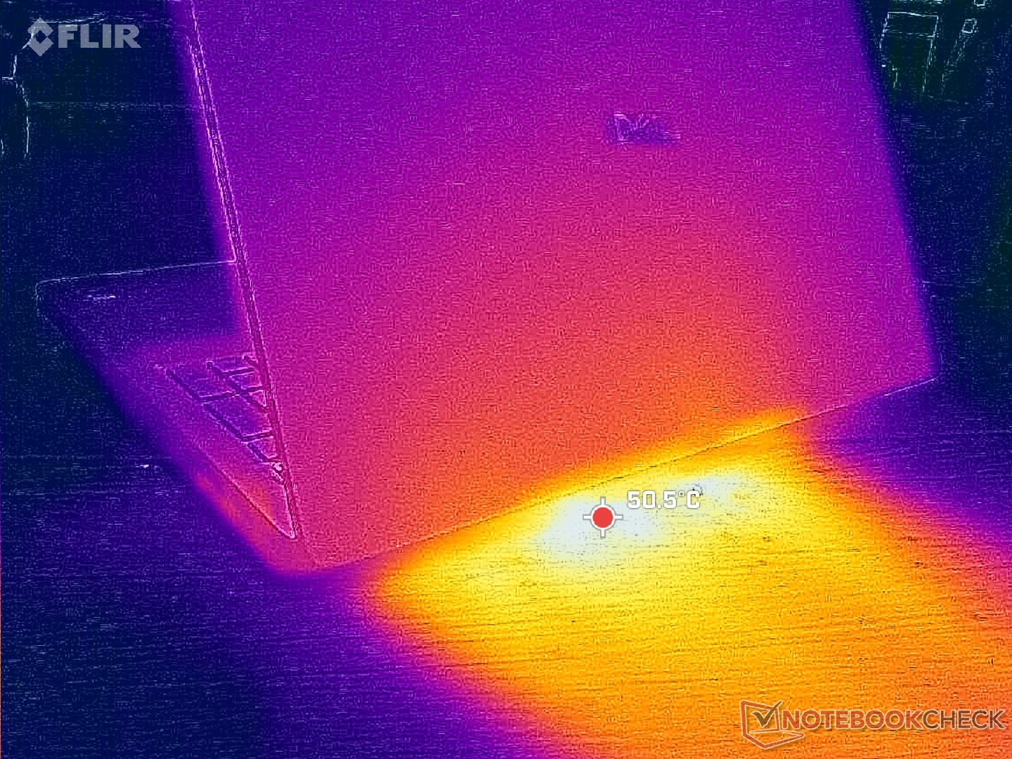 Yttemperaturerna är nästan alltid varma oavsett belastningen på skärmen, vilket sannolikt beror på de slöa fläktarna och de högpresterande komponenterna. Den vänstra halvan av chassit blir märkbart varmare än den högra på grund av den asymmetriska kylningslösningen.