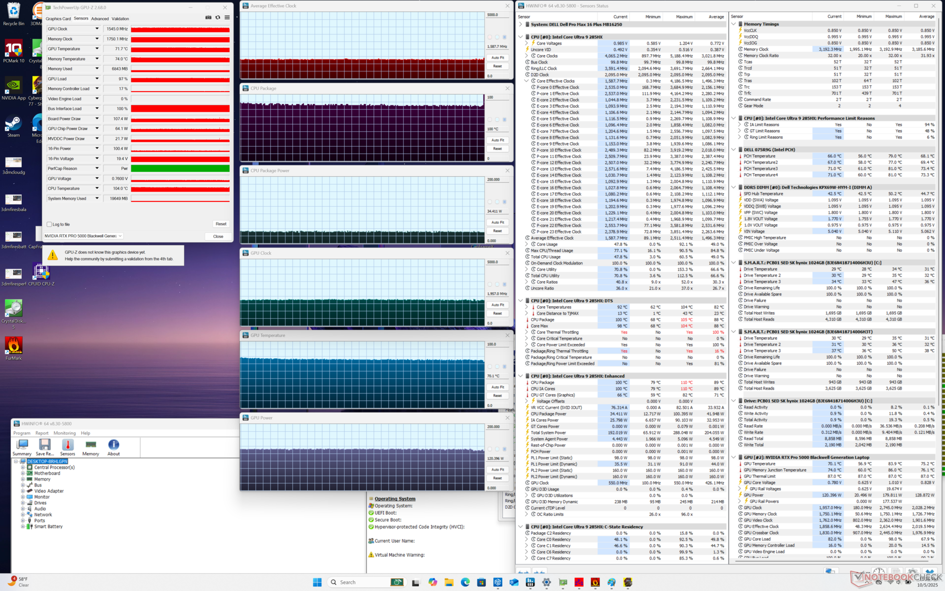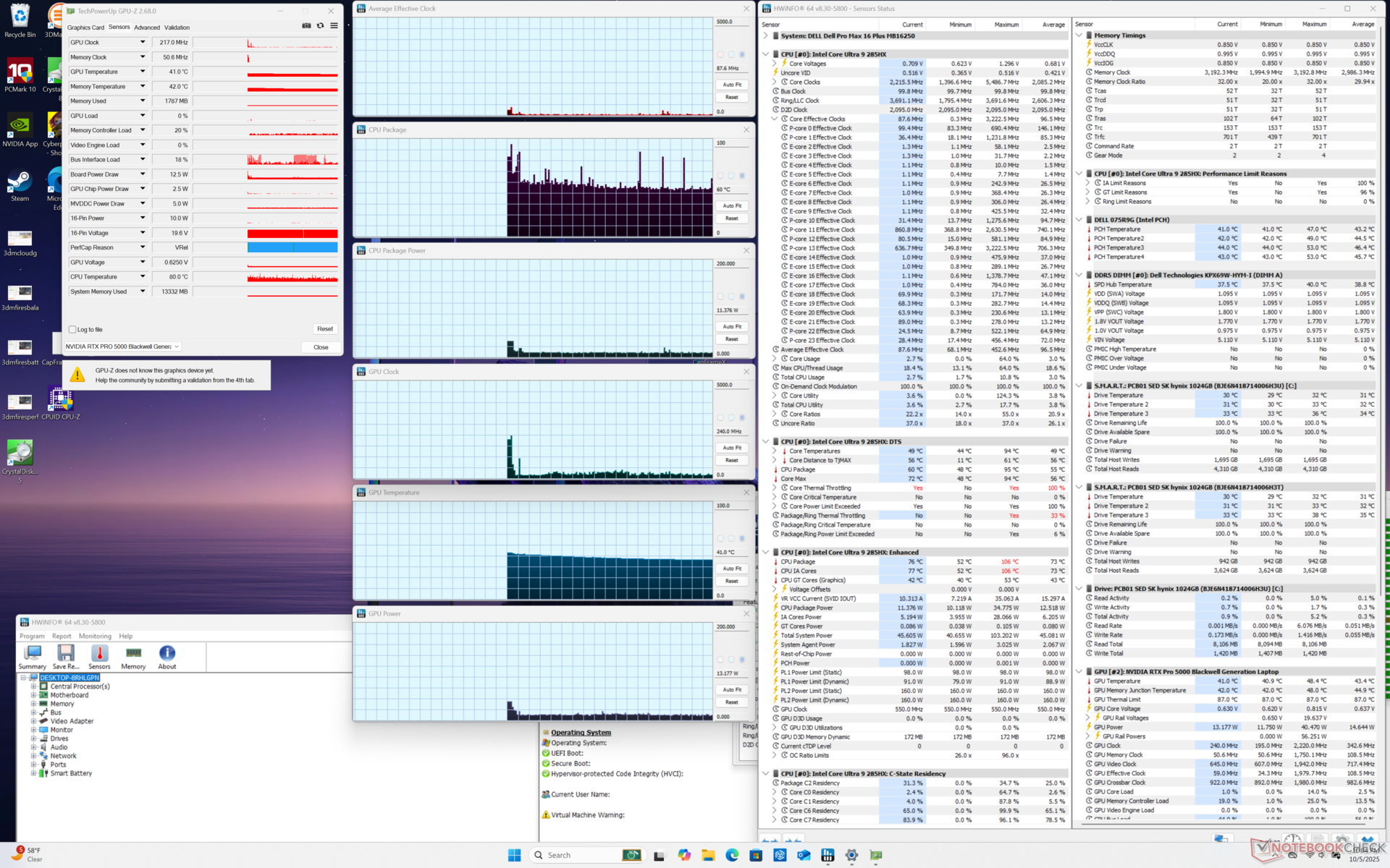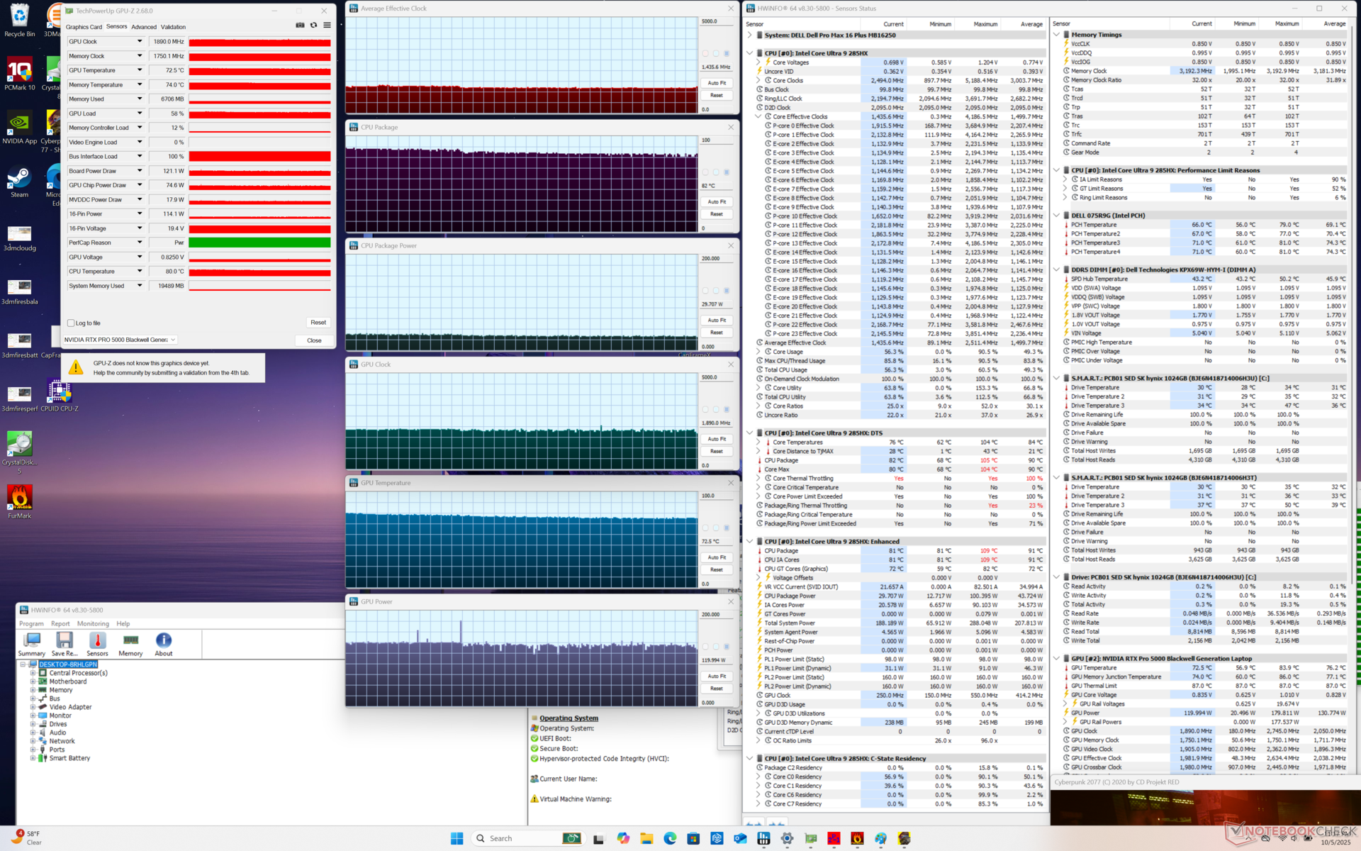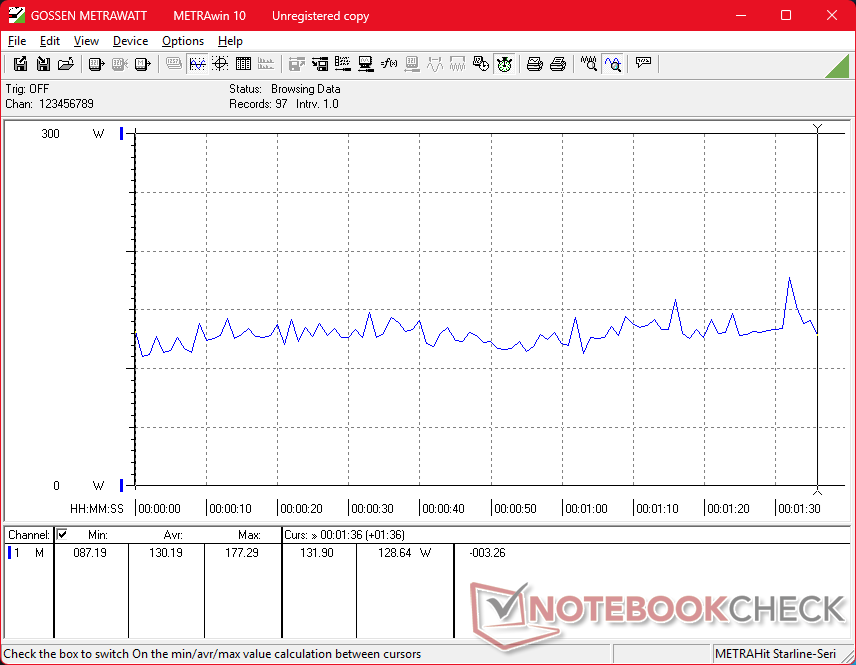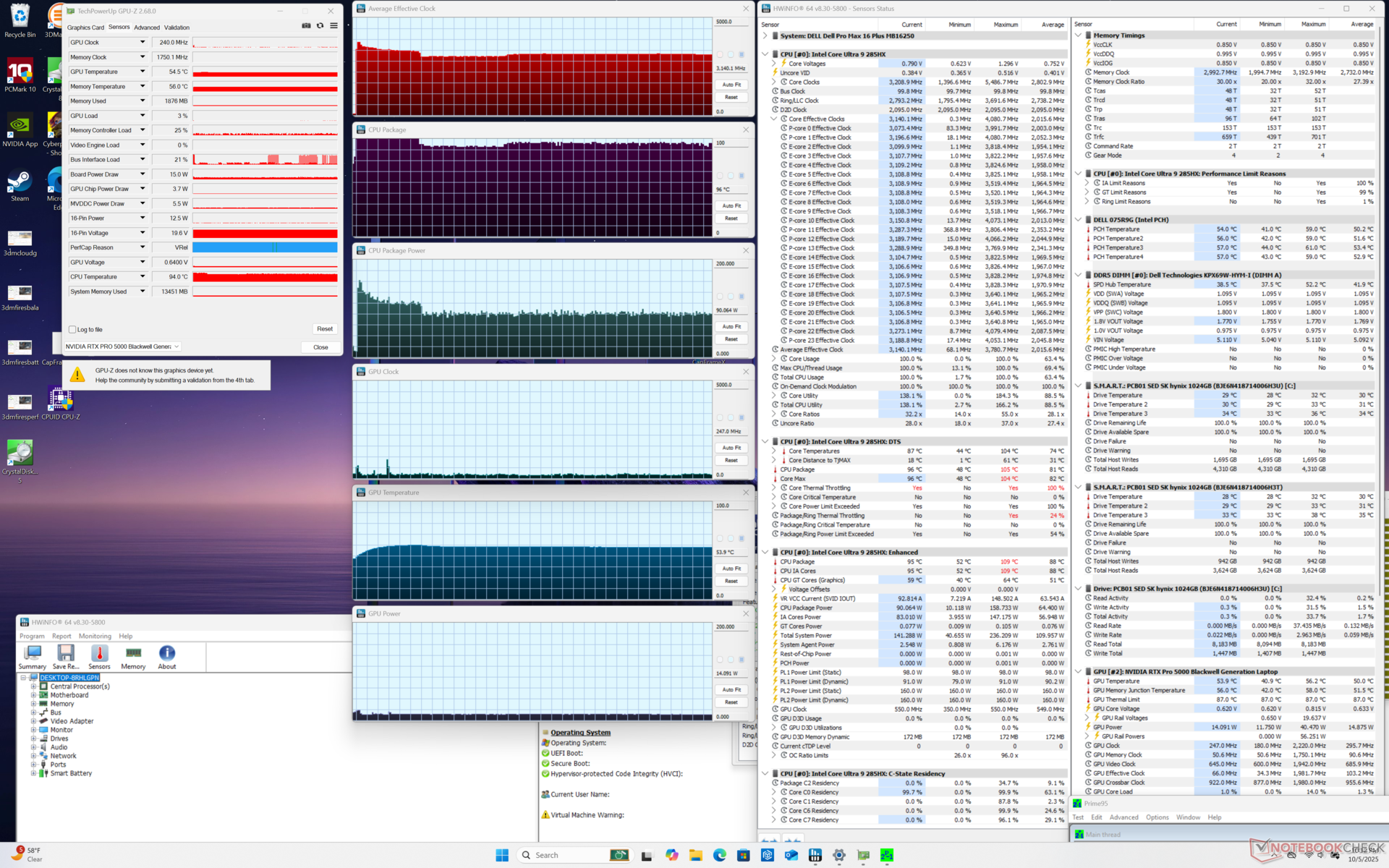 Nackdelarna är i allmänhet små. Strömförbrukningen är nu högre än tidigare med upp till 280 W jämfört med 240 W eller mindre på Precision 7680. Pro Max 16 Plus är visserligen mer kraftfull, men den är också mer krävande för kylningslösningen och har överlag kortare batteritid. CPU-temperaturen i synnerhet kan nå 95 till 105 C när den belastas, vilket påverkar systemets Turbo Boost-prestanda. Samtidigt tenderar GPU:n att stabiliseras på 125 W trots att den är klassad för upp till 175 W. Det är därför troligt att samma CPU och GPU kan köras snabbare på tjockare eller större formfaktorer som 18-tums Pro Max 18 Plus. Pro Max 16 Plus-systemet är ändå en av de snabbaste och mest praktiska arbetsstationerna som finns tillgängliga trots eventuella begränsningar i kylningslösningen.