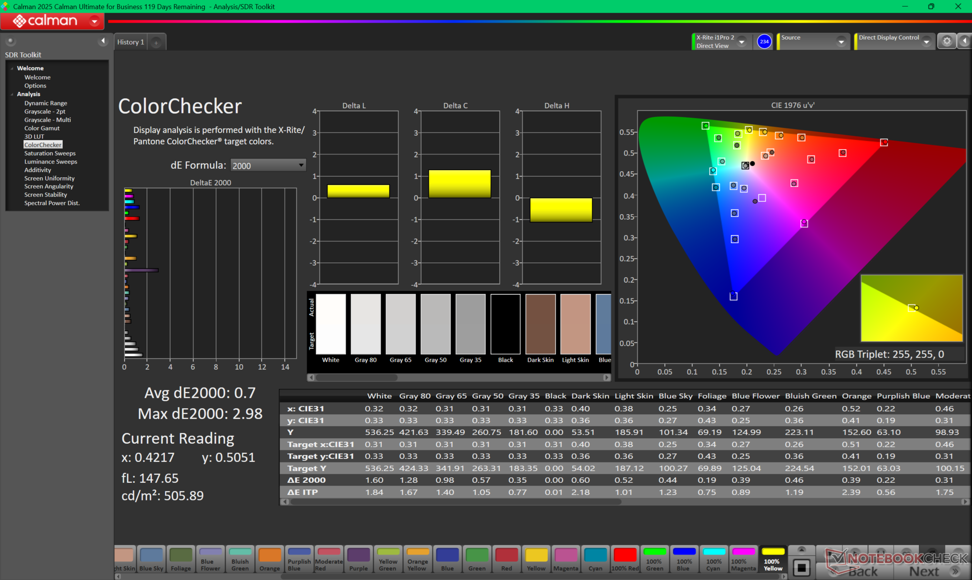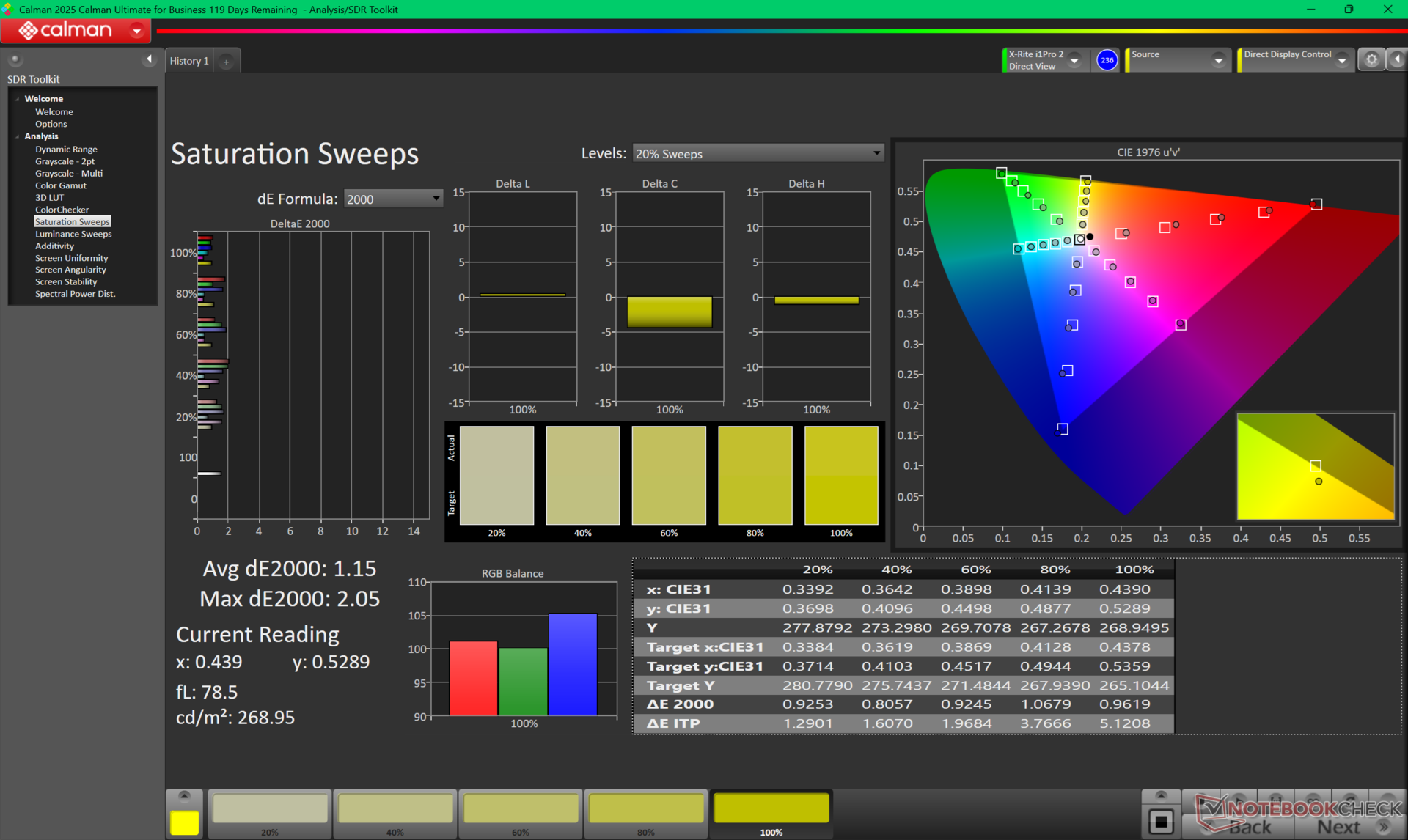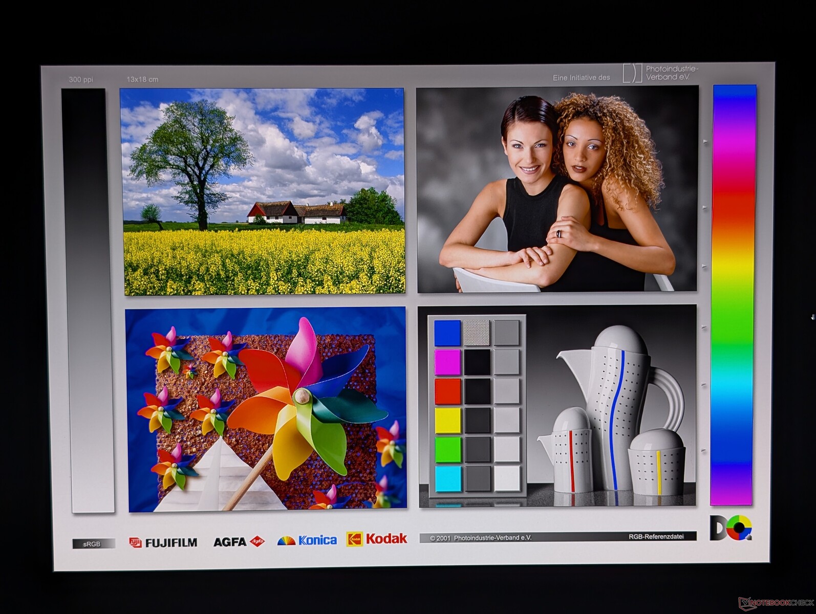 Skärmen är väl kalibrerad mot P3-standarden med genomsnittliga deltaE-värden för gråskala och färg på bara 0,8 respektive 2,42.