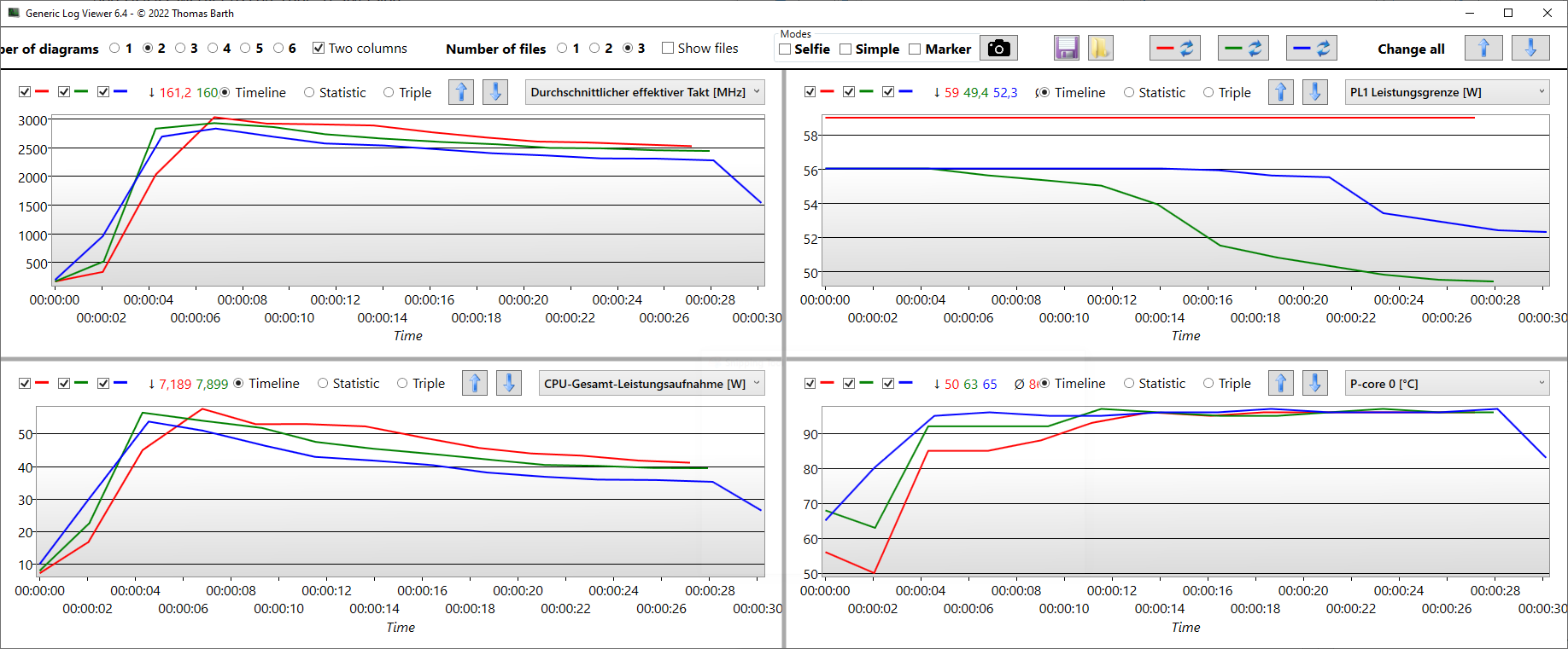 Processorns förbrukning ligger på 30 watt i stresstestet. Dessförinnan kan cirka 60 watt uppnås under några sekunder, men detta sjunker sedan till mellan 40 och 30 watt under den första minuten. Denna strypning utlöses av att P-kärnan når 95 °C (~203 °F). Prestandan påverkades inte efter stresstestet.