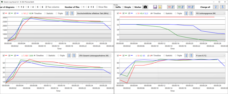 Att välja Core i7-1260P lovar en prestandaökning på drygt 10 % enligt benchmarks. Detta gäller den rena processorkraften, men även systemprestandan. Dessutom ger Core i7 ett plus på 18 % vid kontinuerlig belastning jämfört med Core i5, som stryps mer märkbart i Cinebench-slingan.