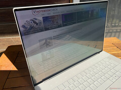 Nya XPS 14 9440 är som standard utrustad med en 14,5-tums Full HD-panel (ingen pekskärm); mot ett tillägg på 300 USD kan du istället välja en högupplöst OLED-pekskärm, som har en upplösning på 3 200 x 2 000 pixlar. Subjektivt sett är den reflekterande panelens bildkvalitet överlag mycket bra, eftersom innehåll visas extremt skarpt och färgerna är levande - men du märker av en liten rastereffekt när du visar ljust innehåll i synnerhet. Vi noterade inte samma problem på den nuvarande OLED-generationen från Samsung (t.ex. Galaxy Book4 Pro 14, recension kommer snart) och Dells OLED ligger lite efter när det gäller ljusstyrka också.