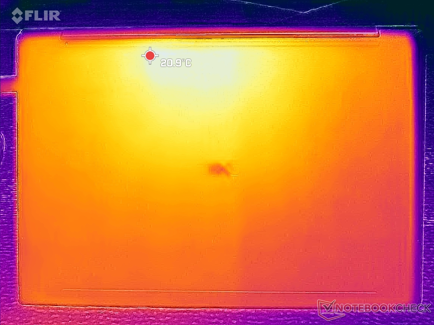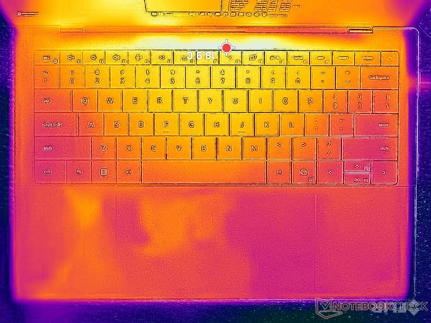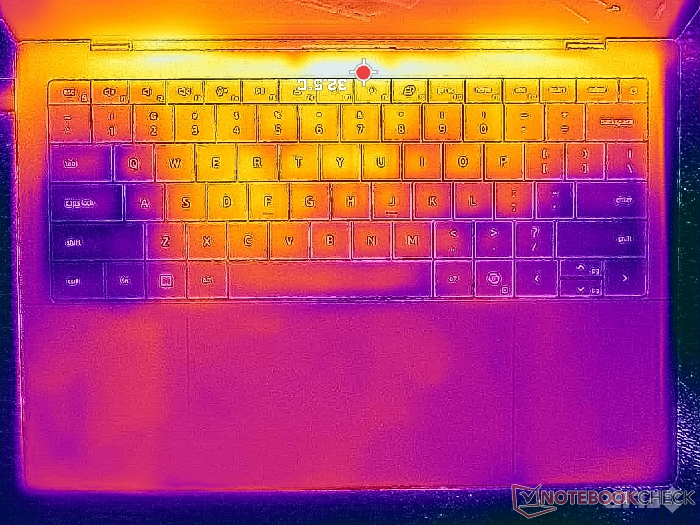 (+) Den maximala temperaturen på ovansidan är 34 °C / 93 F, jämfört med genomsnittet av 36.9 °C / 98 F , allt från 21.1 till 71 °C för klassen Multimedia.