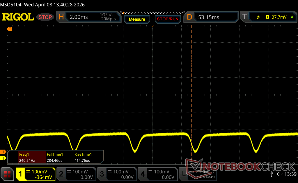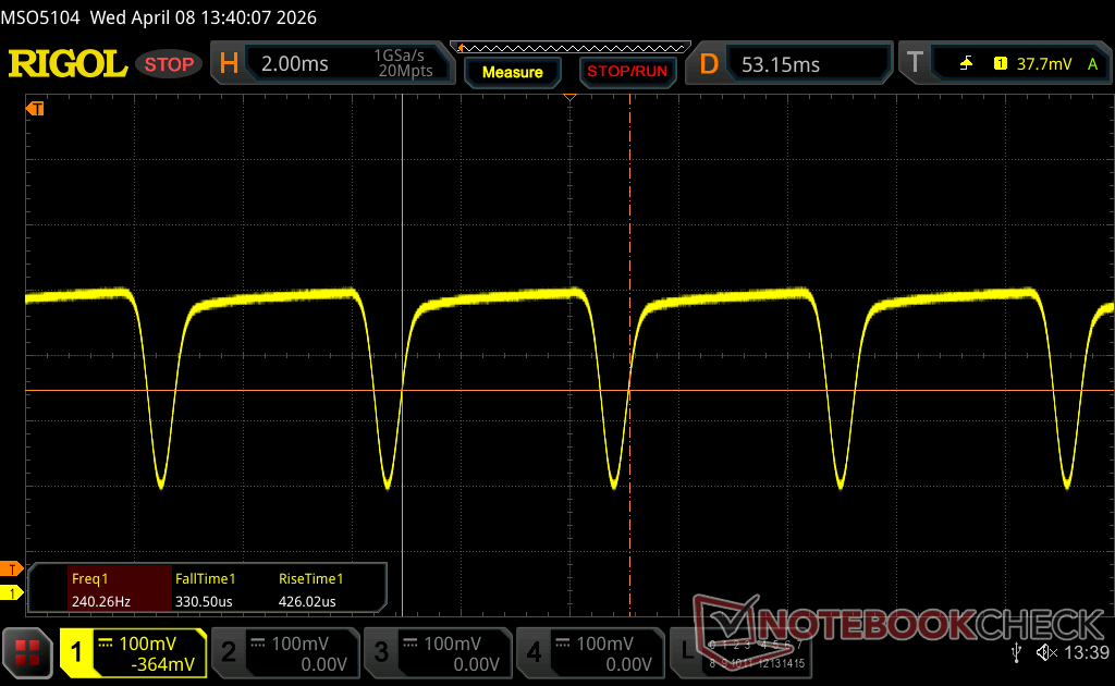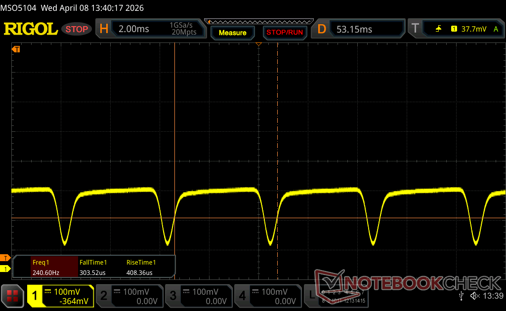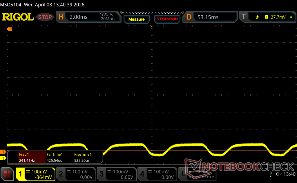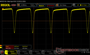 Displayens bakgrundsbelysning flimrar vid 240.2 Hz (i värsta fall, t.ex. med PWM) Flimrande upptäckt vid en ljusstyrkeinställning på 100 % och lägre. Det ska inte finnas något flimmer eller PWM över denna ljusstyrkeinställning. Frekvensen för 240.2 Hz är relativt låg, så känsliga användare kommer sannolikt att märka flimmer och uppleva ansträngda ögon vid den angivna ljusstyrkeinställningen och nedan. Som jämförelse: 52 % av alla testade enheter använder inte PWM för att dämpa skärmen. Om PWM upptäcktes mättes ett medelvärde av 7914 (minst: 5 - maximum: 343500) Hz. | |||