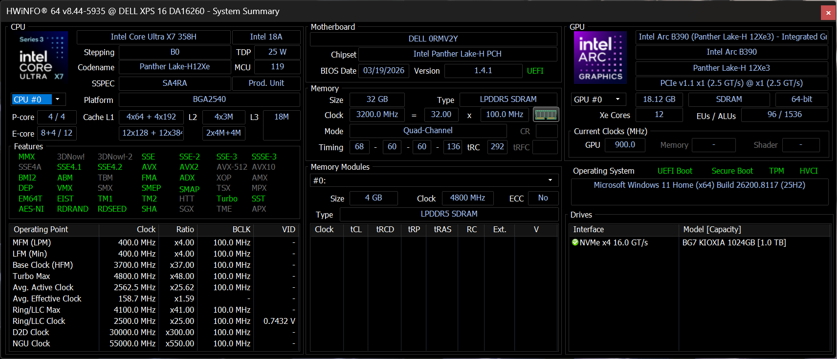 | Dell XPS 16 Core Ultra X7 358H Intel Core Ultra X7 358H ⎘ Intel Arc B390 12 Xe3 Panther Lake iGPU ⎘ 32 GB Minne | Amazon: 1. $2,229.99 Dell XPS 16 9640 Laptop | In... 2. $2,699.00 Dell XPS 16 9640 16.3" Touch... 3. $1,459.00 Dell XPS 13 9340 AI Powered ... Listpris: 2350 USD | 1.7 kg | 14.62 mm | 16.00" 3200x2000 236 PPI OLED | |