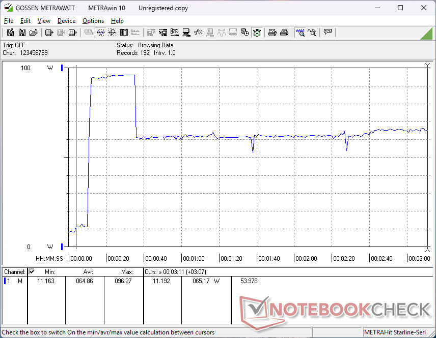 Processorn ökade till 2,9 GHz, 69 W och 100 C när Prime95-stress kördes, för att sedan sjunka till 2,2 GHz, 40 W och 78 C några sekunder senare, vilket tyder på begränsad Turbo Boost-hållbarhet. Strypningen kompletterar våra CineBench R15 xT-loopresultat ovan och strömförbrukningsbeteendet nedan.