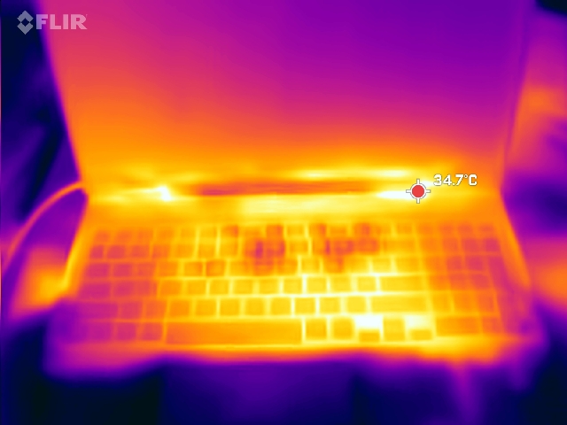 (+) Den maximala temperaturen på ovansidan är 36 °C / 97 F, jämfört med genomsnittet av 40.5 °C / 105 F , allt från 21.2 till 68.8 °C för klassen Gaming.