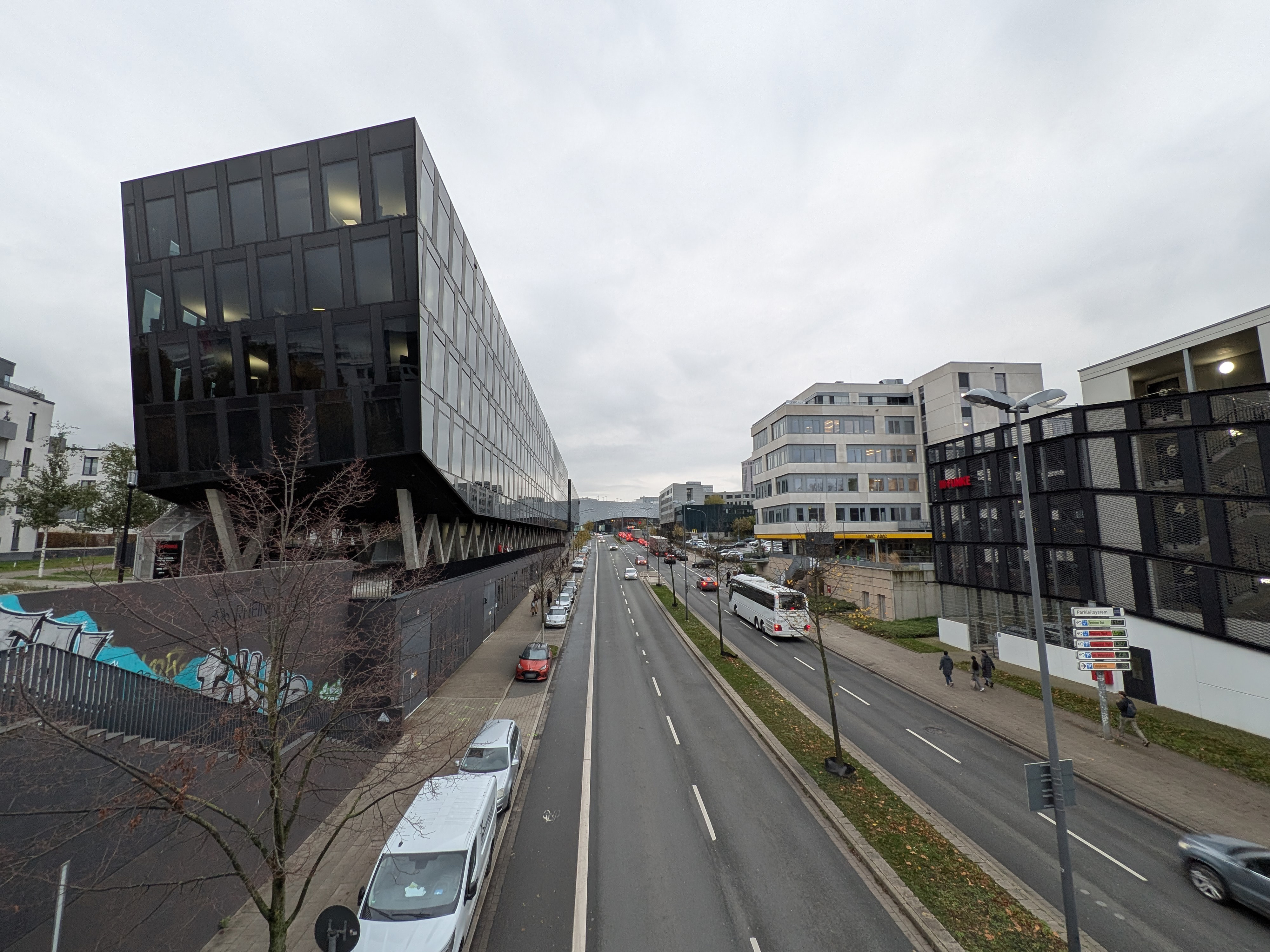 Pixel 9 Pro Folds bakre kamerasystem levererar bra bilder för en vikbar telefon, men de små sensorerna når snabbt sina gränser i mörkret. Även huvudkameran på 48 MPix, som imponerar med bra dynamiskt omfång och solid skärpa i dagsljus, måste acceptera brister på natten med den nu nästan lilla 1/2,0-tums sensorn.