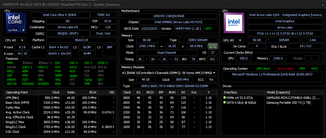 | Lenovo ThinkPad P16 Gen 3 Intel Core Ultra 9 285HX ⎘ NVIDIA RTX PRO 3000 Blackwell Generation Laptop ⎘ 96 GB Minne, 2048 GB SSD | Amazon: Listpris: 4000 Euro | 2.7 kg | 30 mm | 16.00" 1920x1200 142 PPI IPS LED | |