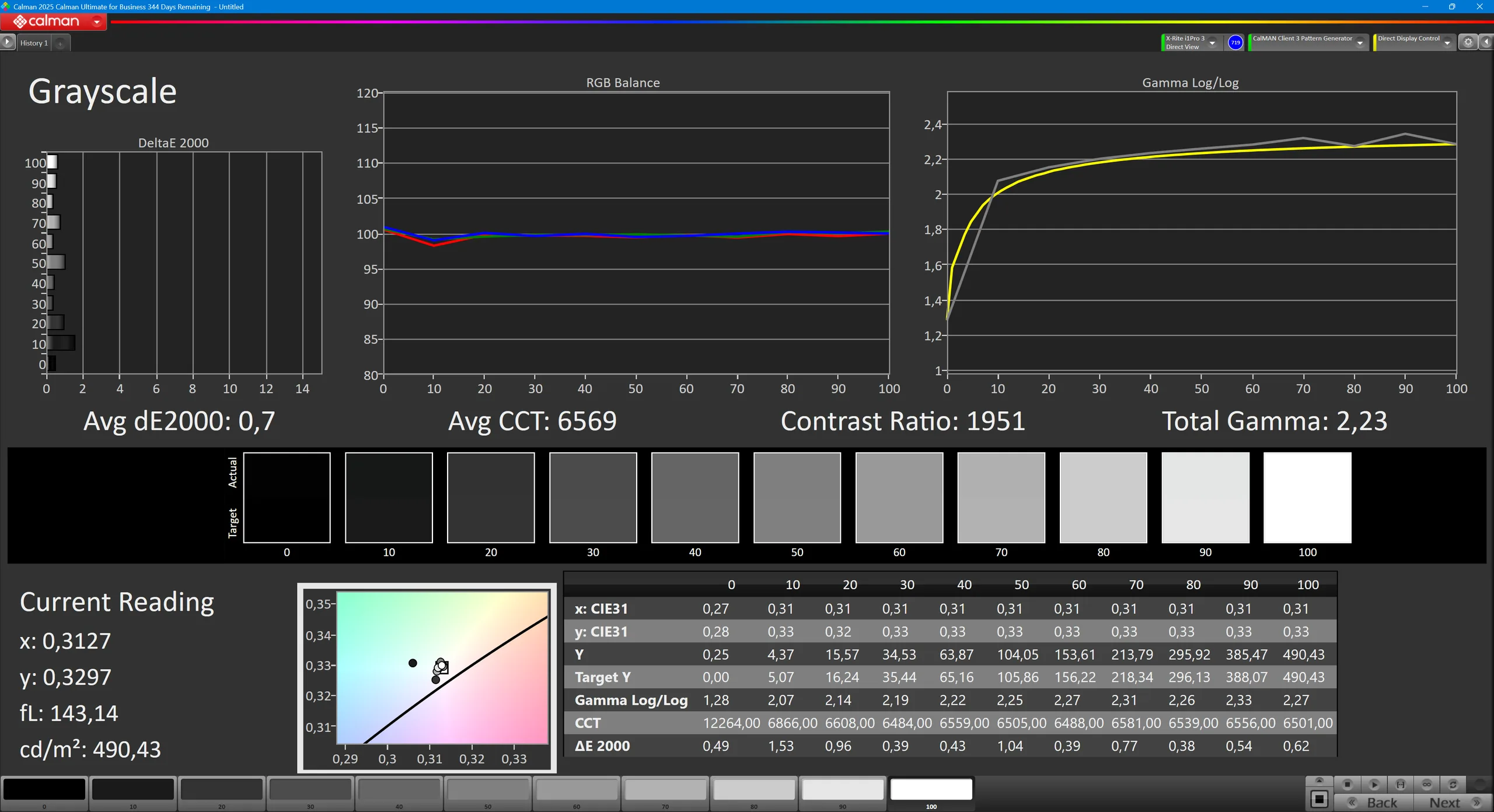 | Greyscale dE 2000 * | 5.7 | 3.6 37% | 0.8 86% | 2 65% | 1.4 75% | 1.4 75% |