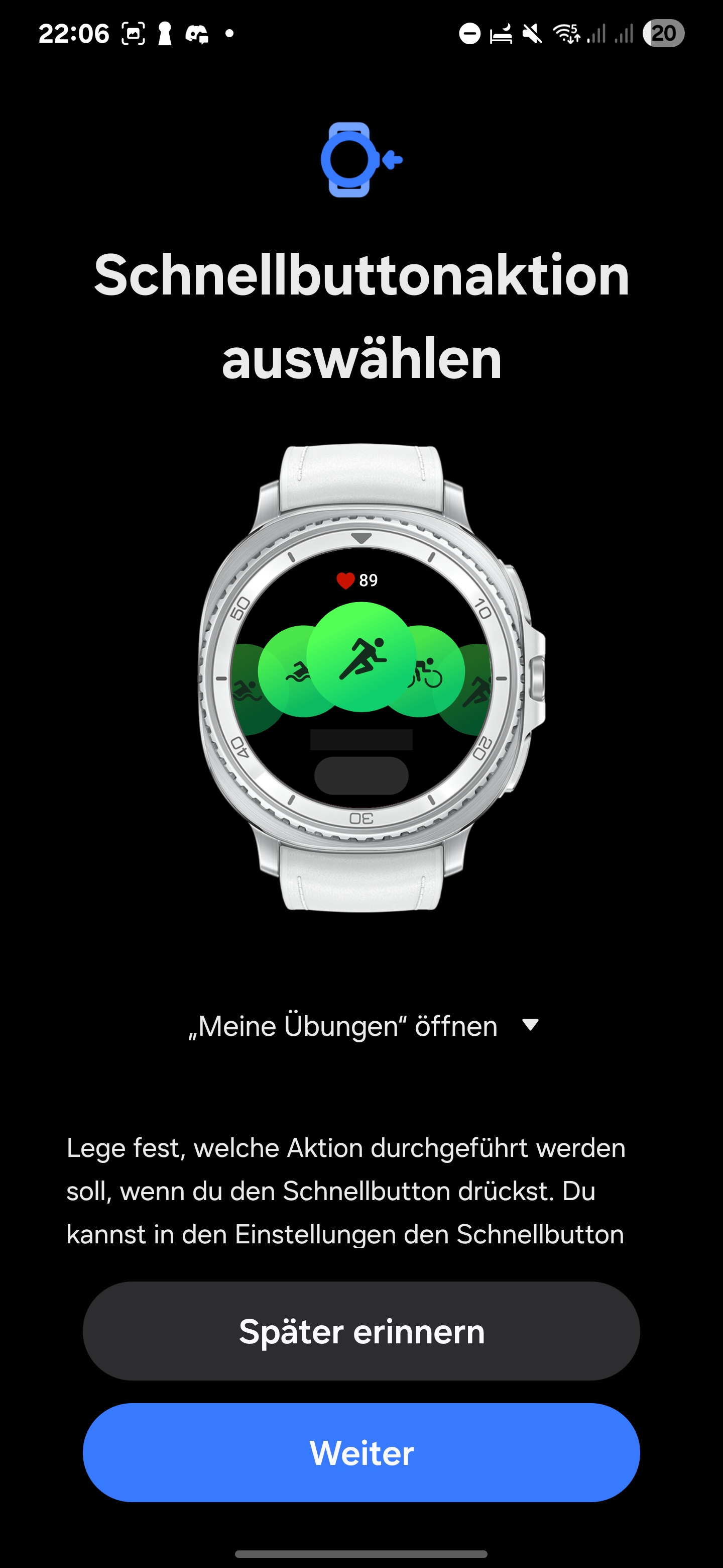 Under installationen tillfrågas användaren om handledsorientering, hälsofunktioner och grundläggande preferenser. När detta är klart visas en översikt i appen och en kort handledning körs direkt på klockan. All fitnessdata hanteras via appen Samsung Health.