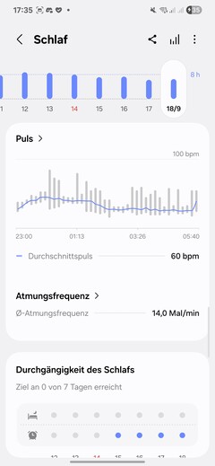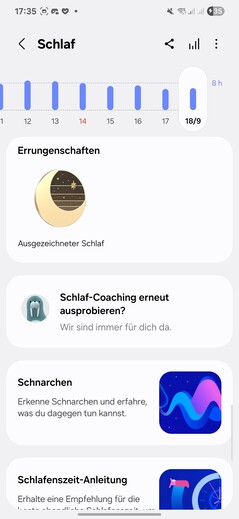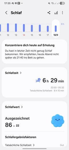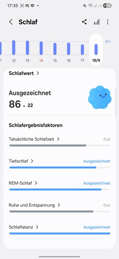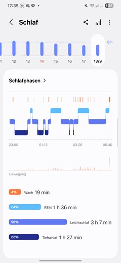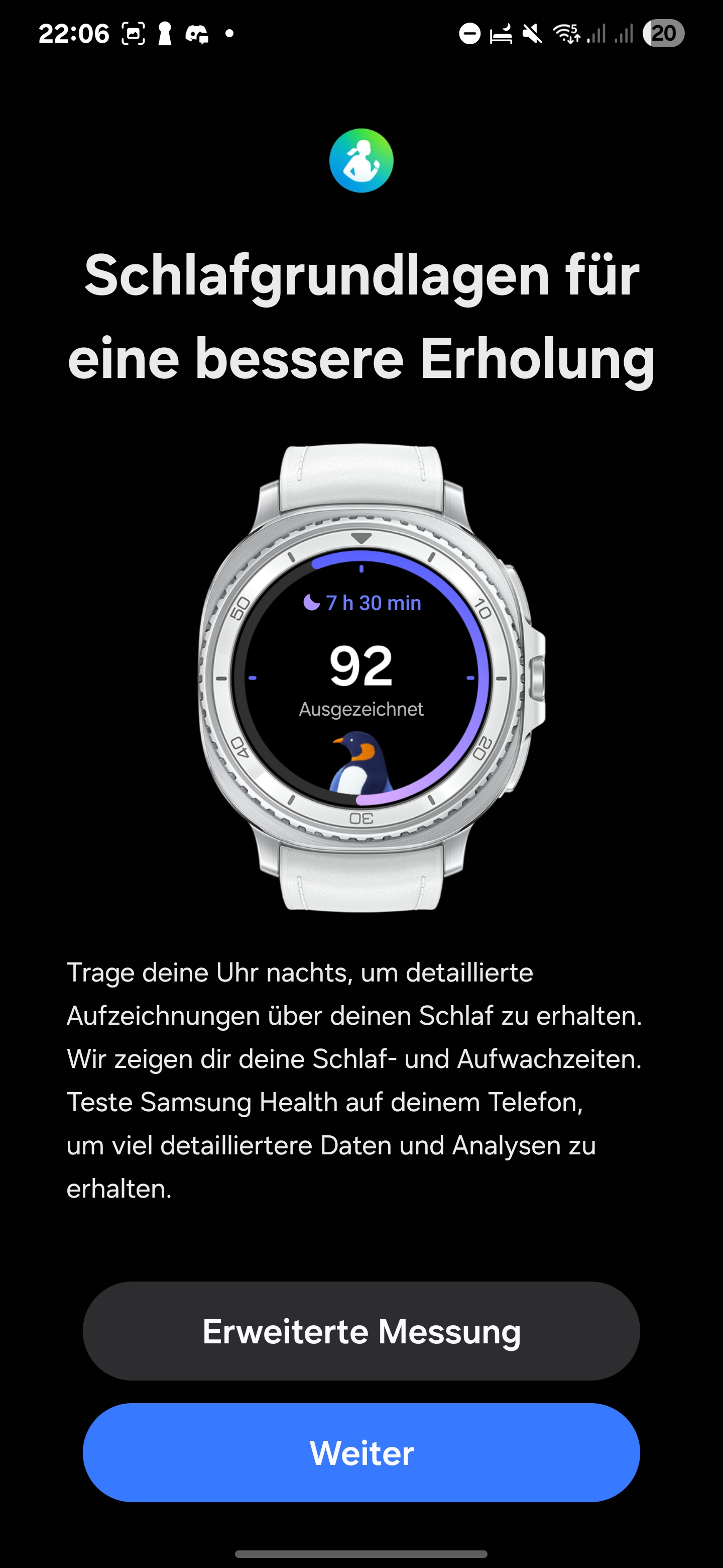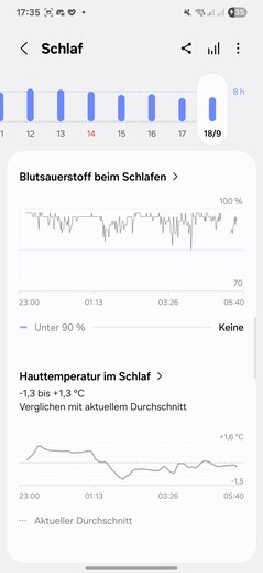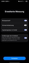 Samsung använder ett Sleep Score-system för att spåra vila. Det kombinerar mätvärden som total sömntid, djup- och REM-faser, återhämtning och latens, och kompletteras med personliga rekommendationer och långsiktiga trender. Klockan registrerar också hjärtfrekvens, temperatur, syremättnad och andningsfrekvens. Snarkningar och sömnapné kan upptäckas när smartklockan är ihopkopplad med en smartphone.