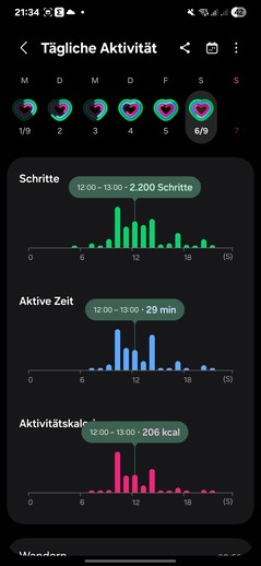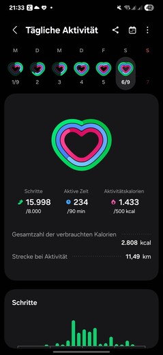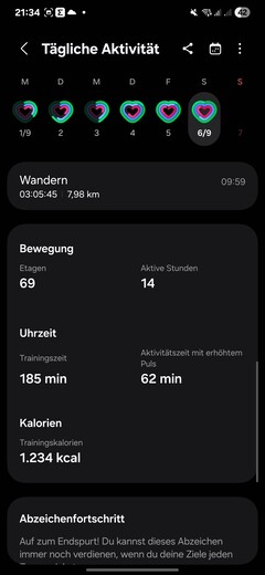 Automatisk detektering av träningspass fungerar mycket bra. Samsung Health-appen innehåller också videobaserade träningskurser, varav vissa kräver betalning. Under testningen registrerade vi ibland felaktiga poster för gymnastik när vi använde snabbknappen.