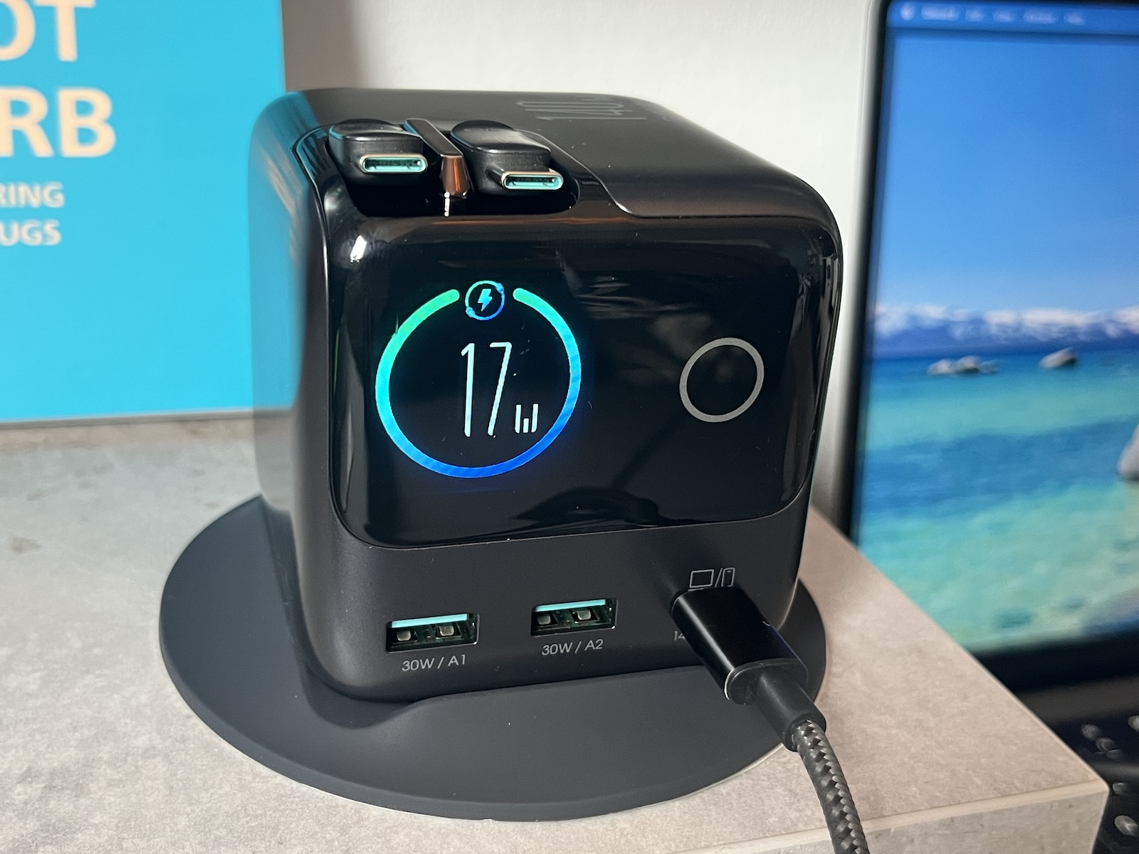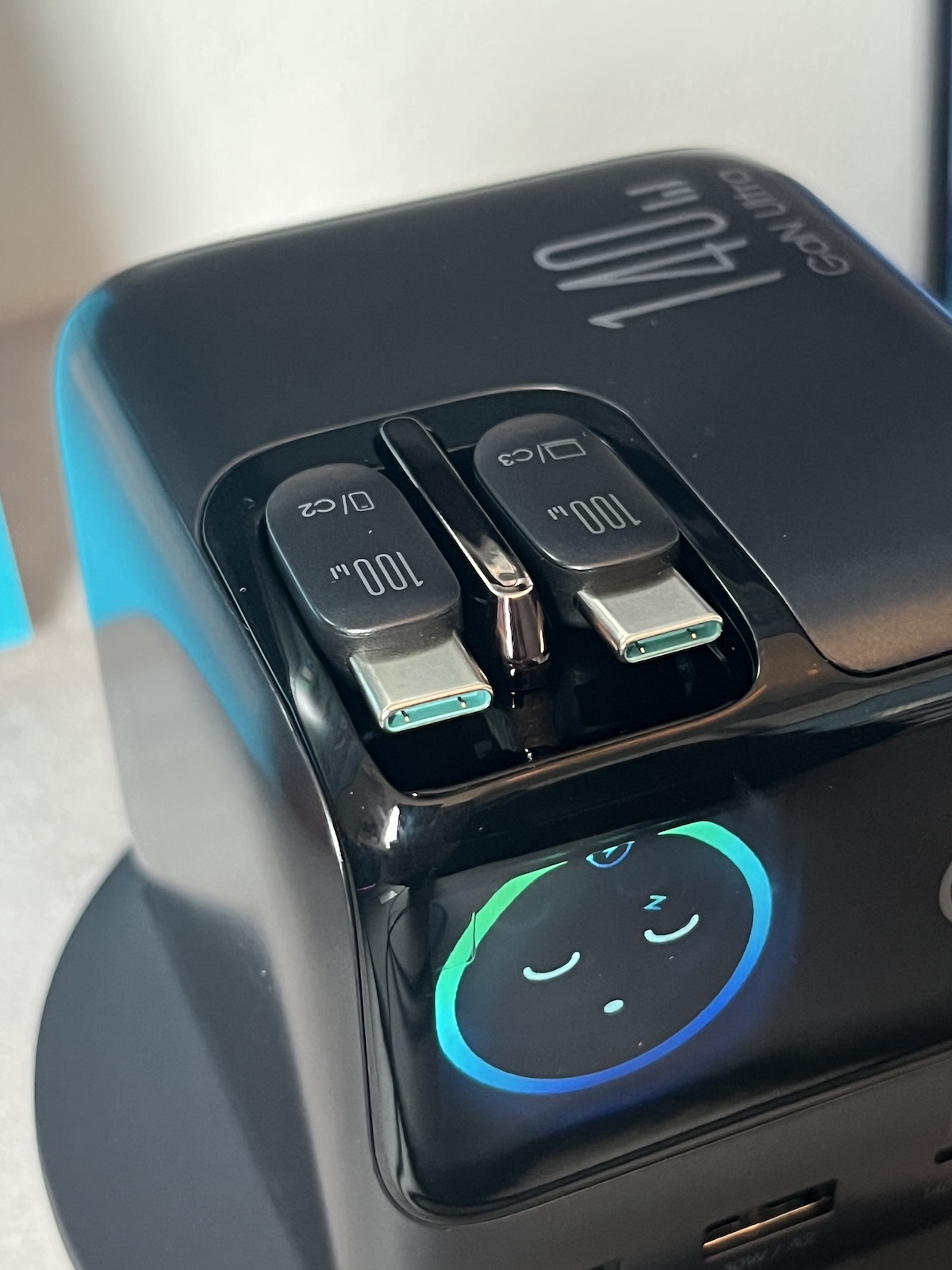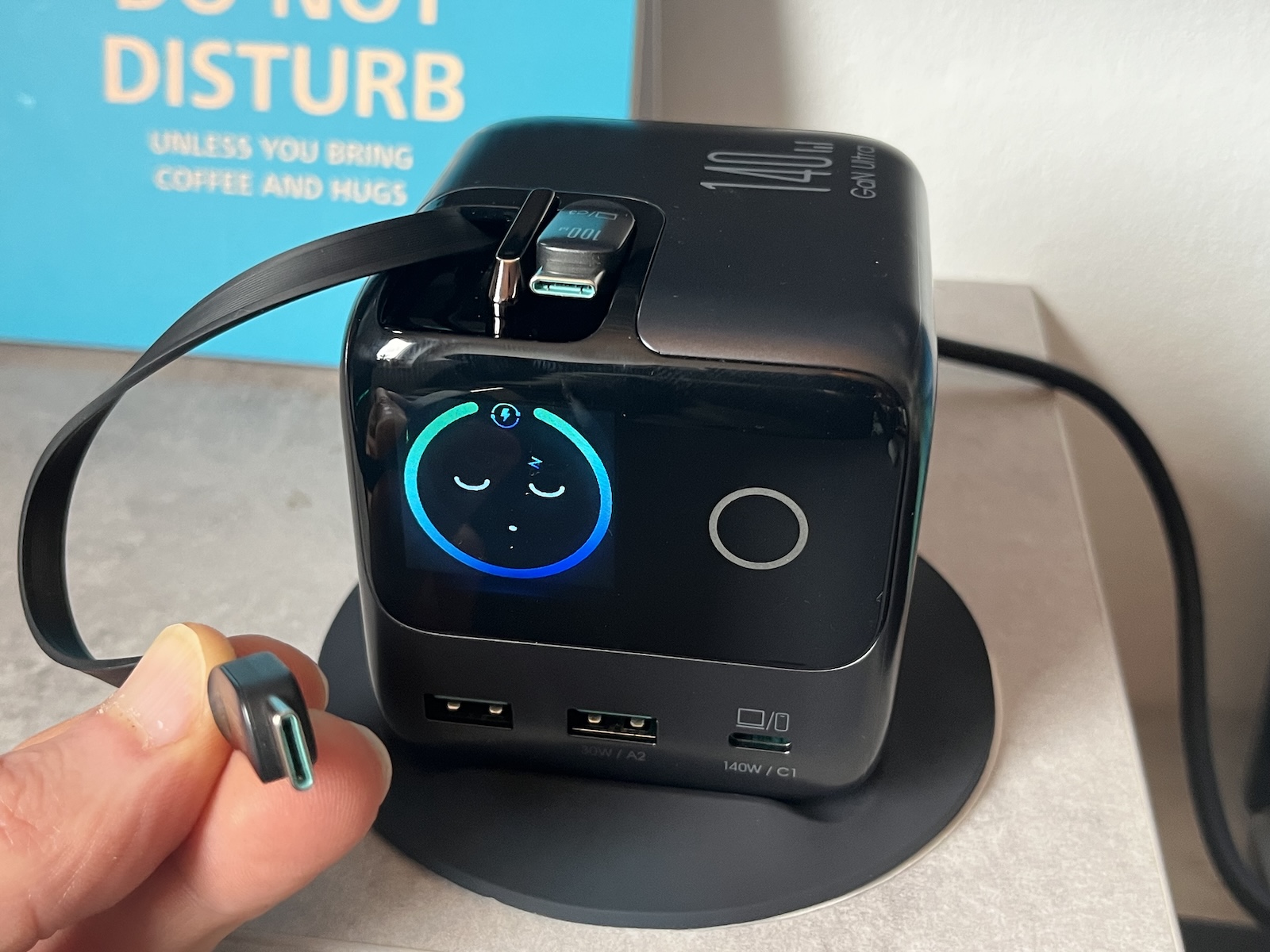 Joyroom Podix 140W Charger har många portar och kan därför ersätta flera separata laddare och kablar. Effekten på upp till 140 watt räcker för att förse även bärbara datorer (på kontoret) med tillräckligt med ström och samtidigt ladda olika små prylar. Man bör vara försiktig när man fördelar portarna, eftersom uteffekten för enskilda portar begränsas kraftigt när flera portar används. Höjdpunkten är de två Type-C-kablarna, som förvaras ihoprullade i enheten och kan förlängas upp till cirka 75 centimeter vid behov. Detta innebär att laddningskablar för mobiltelefoner som ligger och skräpar är ett minne blott.