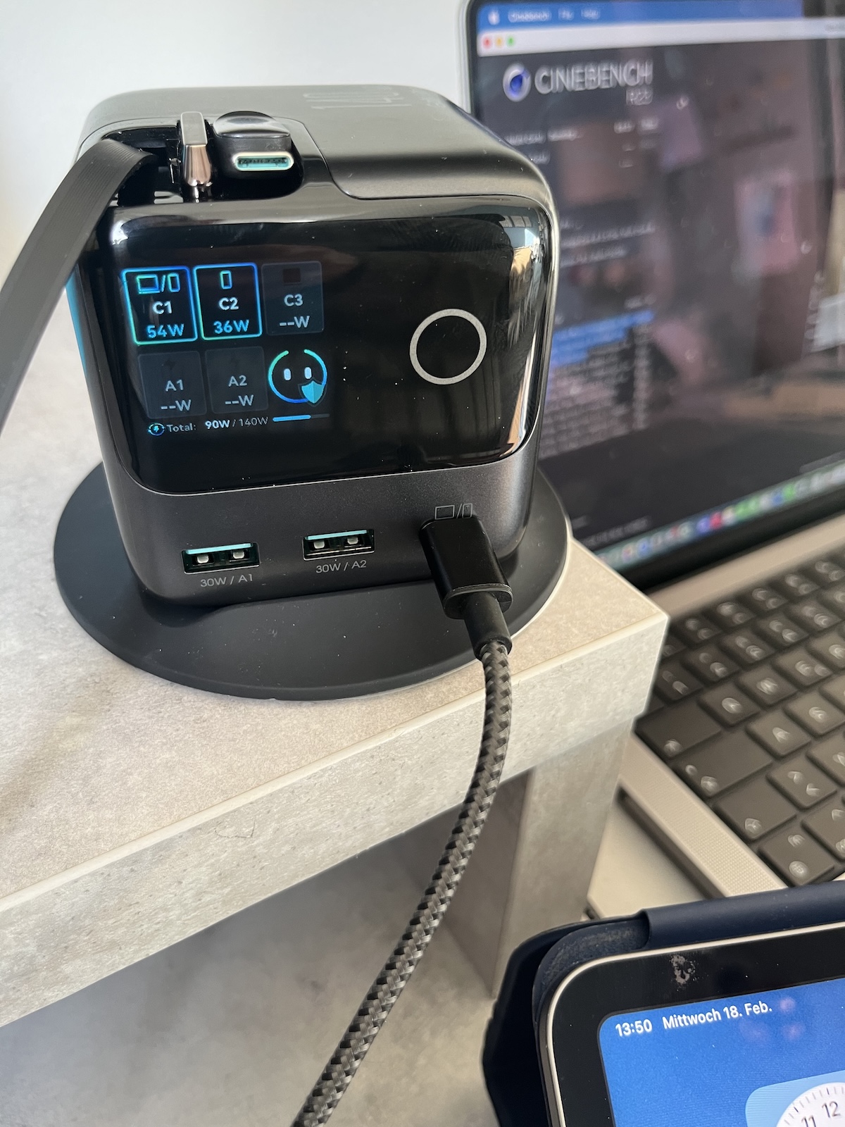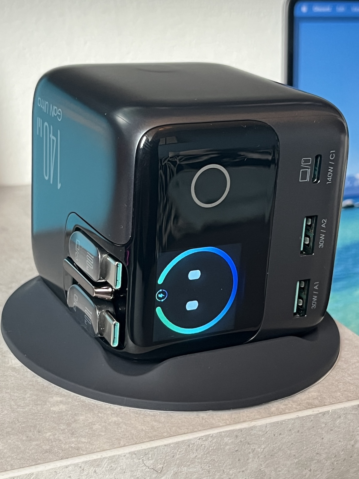 Joyroom Podix 140W Charger kom ursprungligen från ett crowdfunding-projekt. Den är inte utformad som en mobil strömförsörjningsenhet, utan snarare som en universell laddningsstation för hemmet och kontoret. Vår våg visade 464 gram, helt klart för mycket för att ta med sig regelbundet. Den stationära användningen understryks av det medföljande gummistativet, som har en självhäftande (och tvättbar) silikonbeläggning på undersidan. Själva laddaren hålls på plats magnetiskt. I princip kan stativet tas bort, men då måste den hållas på plats med den andra handen när man använder de självlåsande Type-C-kablarna. Mer om detta senare. Det är också möjligt att luta den mot en sidoyta; ett trefaldigt tryck på displayen justerar dess orientering.