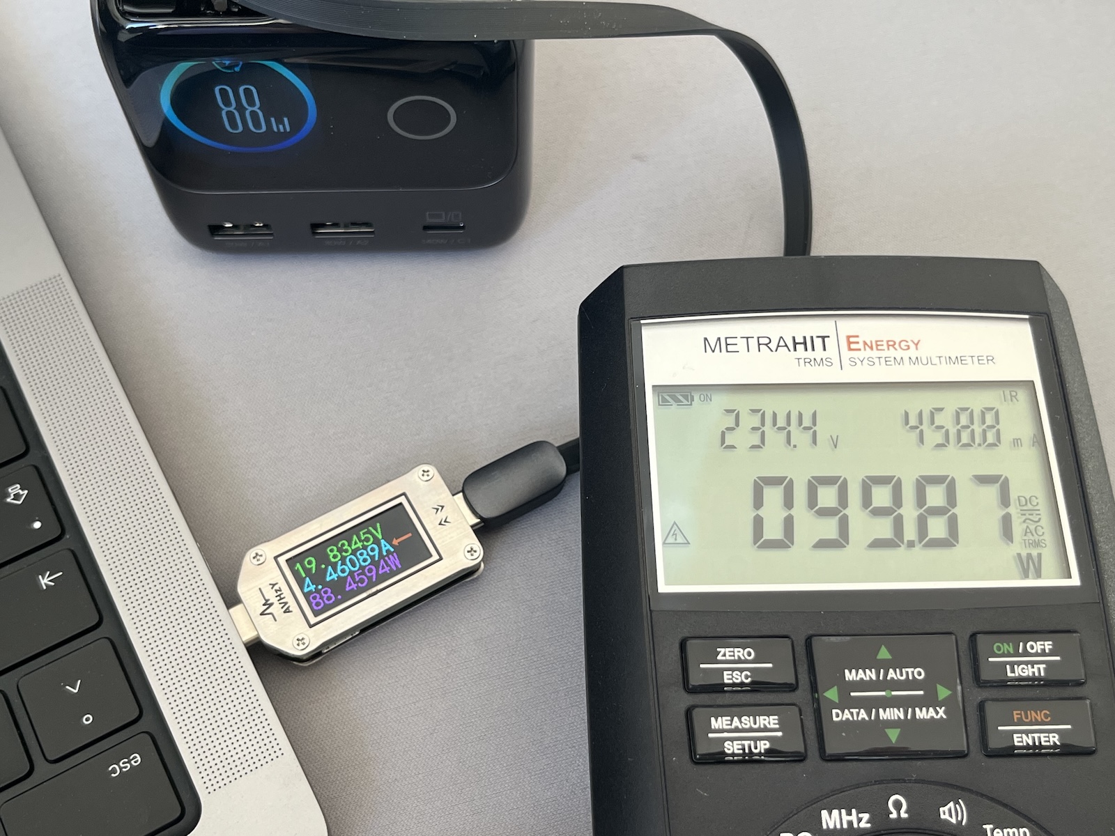 Vi tittade också närmare på effektiviteten och noggrannheten hos de angivna effektvärdena. För detta ändamål använde vi en högkvalitativ Gossen Metrawatt multimeter och en USB-effektmätare från AVHzY. Enligt våra jämförelser stämmer de anslutna konsumenternas effektvärden som visas på displayen överens inom ett intervall på 0-5% avvikelse.