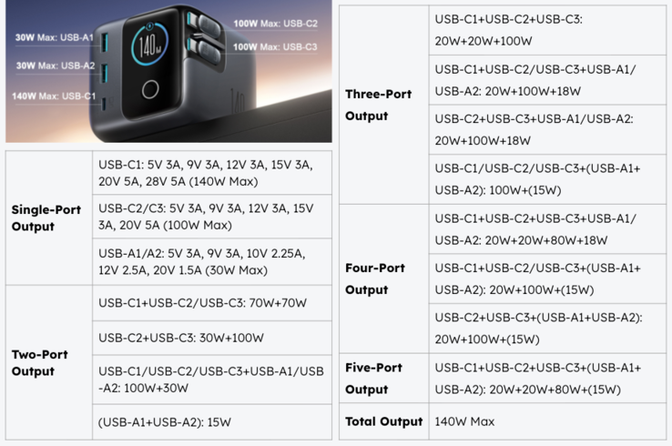 Detta är definitivt ett problem som kan uppstå i praktisk användning och som du bör vara medveten om, även om detta inte bara påverkar laddaren i fråga. Den stora fördelen med Joyroom Podix Charger jämfört med andra lösningar: den inbyggda displayen ger alltid information om den tillgängliga effekten vid de enskilda portarna och gör att du snabbt kan se om tilldelningen bör ändras till förmån för högre effekt. Följande tabell (tryckt på förpackningen) visar strömfördelningen för portarna med enstaka och flera tilldelningar: