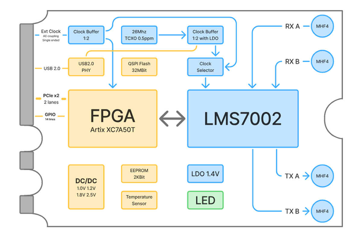 XSDR är baserad på Lime Microsystems LMS7002M RF-transceiver i kombination med en AMD Artix-7 XC7A50T FPGA. Denna kombination täcker ett avstämningsområde på 30 MHz till 3,8 GHz. SDR stöder samplingsfrekvenser från 0,1 MSPS upp till 122,88 MSPS i SISO-läge och över 80 MSPS i MIMO-läge, med kanalbandbredder från 0,5 MHz till 90 MHz. Fyra MHF4-antennkontakter ger tillgång till de två RX- och två TX-kanalerna.
