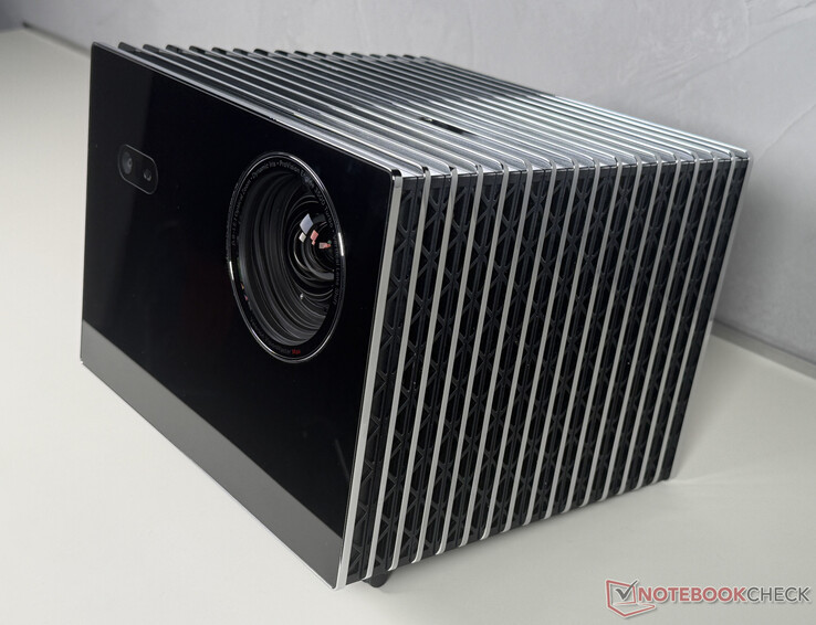 Redan vid första anblicken är Valerion VisionMaster Max ett riktigt statement. Enheten mäter ca 25 x 25 x 20 cm och väger 7,5 kg, levereras i en konstläderlåda och har en elegant design med ett högglansigt svart hölje och metallister. Detta förvandlar projektorn till ett designobjekt som inte behöver gömma sig ens i eleganta interiörer.