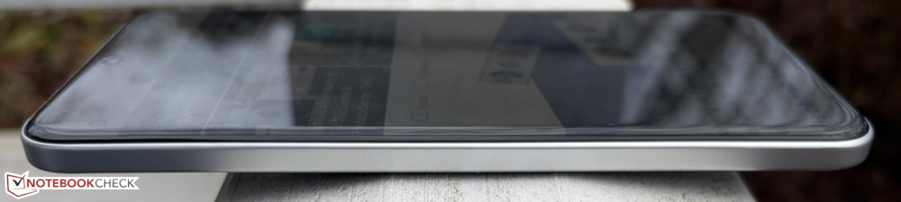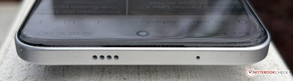 Displayglaset, som har en extra skyddsfilm, är tillverkat av Gorilla Glass Victus 2 och är något rundat i hörnen och kanterna. Tillsammans med de mycket smala skärmkanterna på alla sidor ger detta Xiaomi-telefonen ett mycket högkvalitativt utseende. En aluminiumram förbinder fram- och baksidan och Poco M8 Pro 5G är också damm- och vattentät tack vare sin IP68-certifiering.