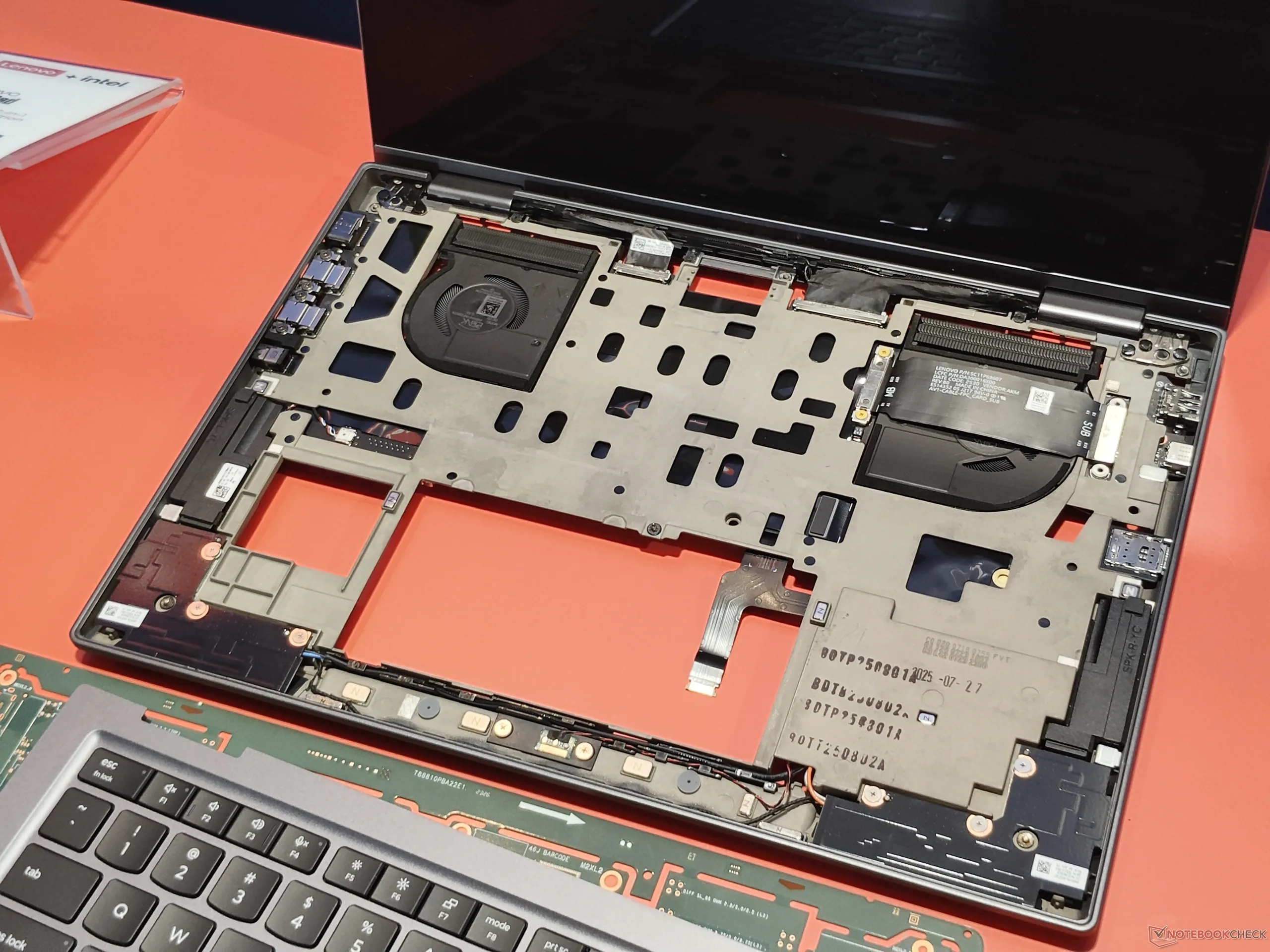 En annan fördel är att det tillgängliga utrymmet utnyttjas bättre, därav "space frame". Genom att placera vissa komponenter på andra sidan av den nya mittramen, som skärmkontakterna och Wi-Fi-antennerna, kunde Lenovo frigöra värdefullt utrymme, som användes för att öka storleken på kylsystemet - vilket gör det möjligt att kyla upp till 30 W under full belastning istället för bara 22,5 W på den tidigare X1 Carbon Gen 13(tillgänglig på Amazon). Detta är särskilt praktiskt med de nya Panther Lake-processorerna, eftersom Intel Core Ultra X7 behöver mer energi för att prestera betydligt bättre än de tidigare Lunar Lake-processorerna. Med det nya mindre moderkortet kunde Lenovo dessutom göra USB C-portarna modulära och placera några av de andra portarna på ett separat dotterkort.