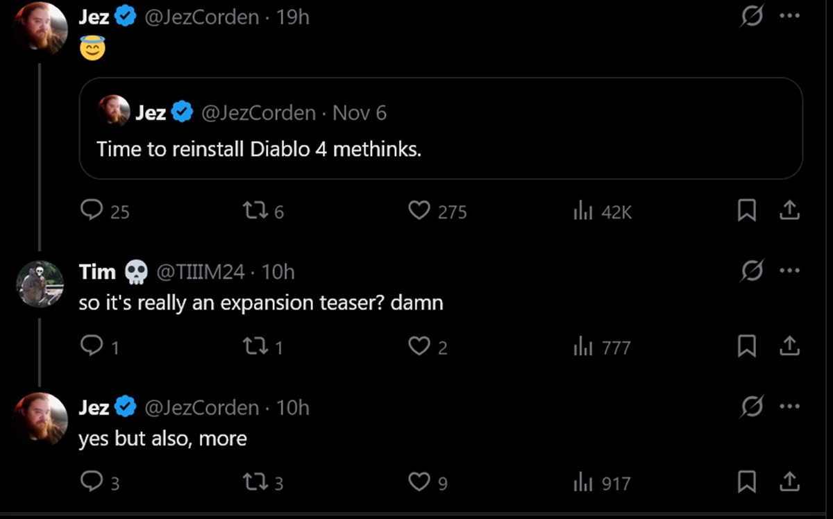 Corden påminde spelarna om ett uttalande från den 6 november där han föreslog ominstallation av Diablo 4. Mer nyligen, svarar på skulpturförvirringenavfärdade han God of War som en möjlighet. En läsare frågade sedan Corden om en potentiell Diablo 4-expansion, vilket ledde till ett "ja men också, mer" svar.