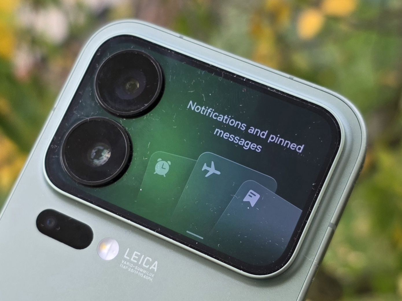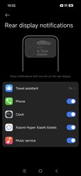 Den bakre OLED-panelen är mycket lättläst tack vare sin höga ljusstyrka och skarpa display. Förutom att visa tiden och ta emot samtal kan användaren svepa nedåt för att visa meddelanden och styra enskilda appar, t.ex. Xiaomis musikapp. Det går dock inte att installera tredjepartsappar här, vilket begränsar användbarheten i vardagen. Det som återstår är möjligheten att använda Leica-kamerorna på baksidan för videor och selfies.