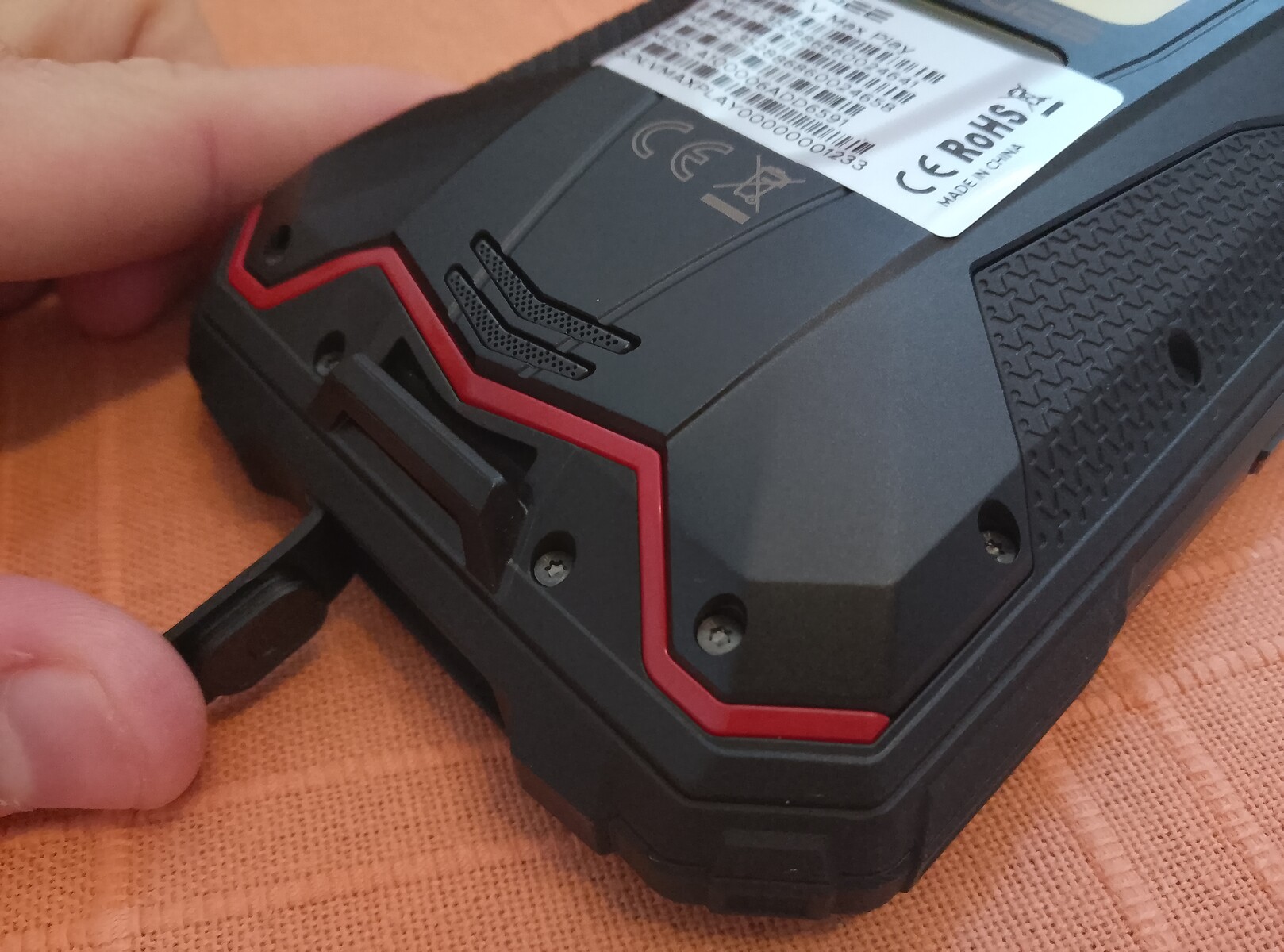 SIM-kortfacket till vänster har utskärningar för 2 nano-SIM-kort och ett micro-SD-kort och är lätt att ta ut och sätta tillbaka. V Max Play har totalt 5 knappar; dessa är, i ingen särskild ordning, volym upp/ned-knapparna, ström, projektor och en anpassad åtgärdsknapp.