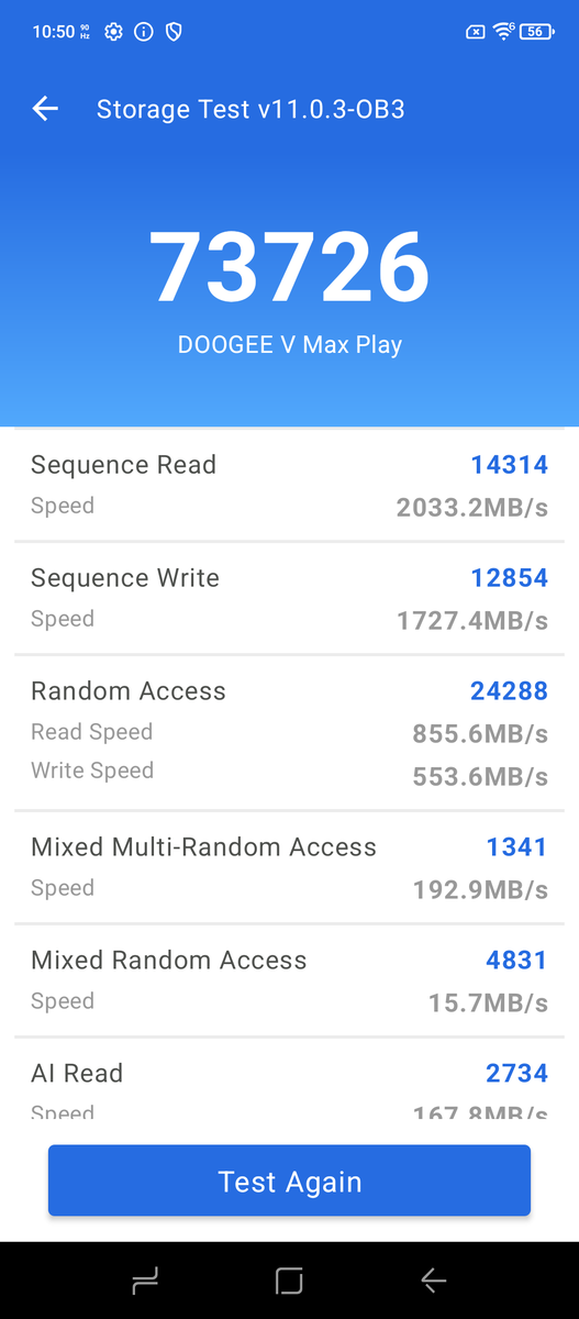Dess 512 GB lagringschip är imponerande snabbt, med ~ 2 GB / s sekventiella läsningar. De 16 GB RAM och den SoC som används är också tillräckliga för de flesta uppgifter; AnTuTu tror att den testade V Max Play är byggd runt Mediateks Dimensity 7300Xsom inte skiljer sig mycket från Dimensity 7300. Båda har 4 "stora" och 4 "små" kärnor med måttliga klockhastigheter.