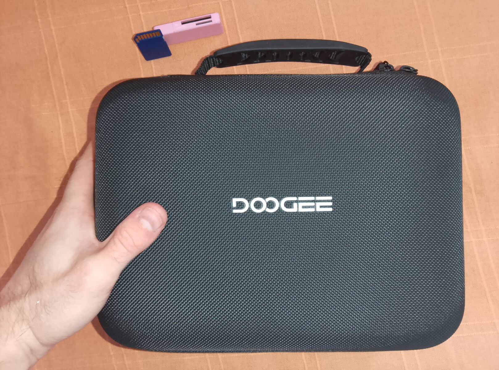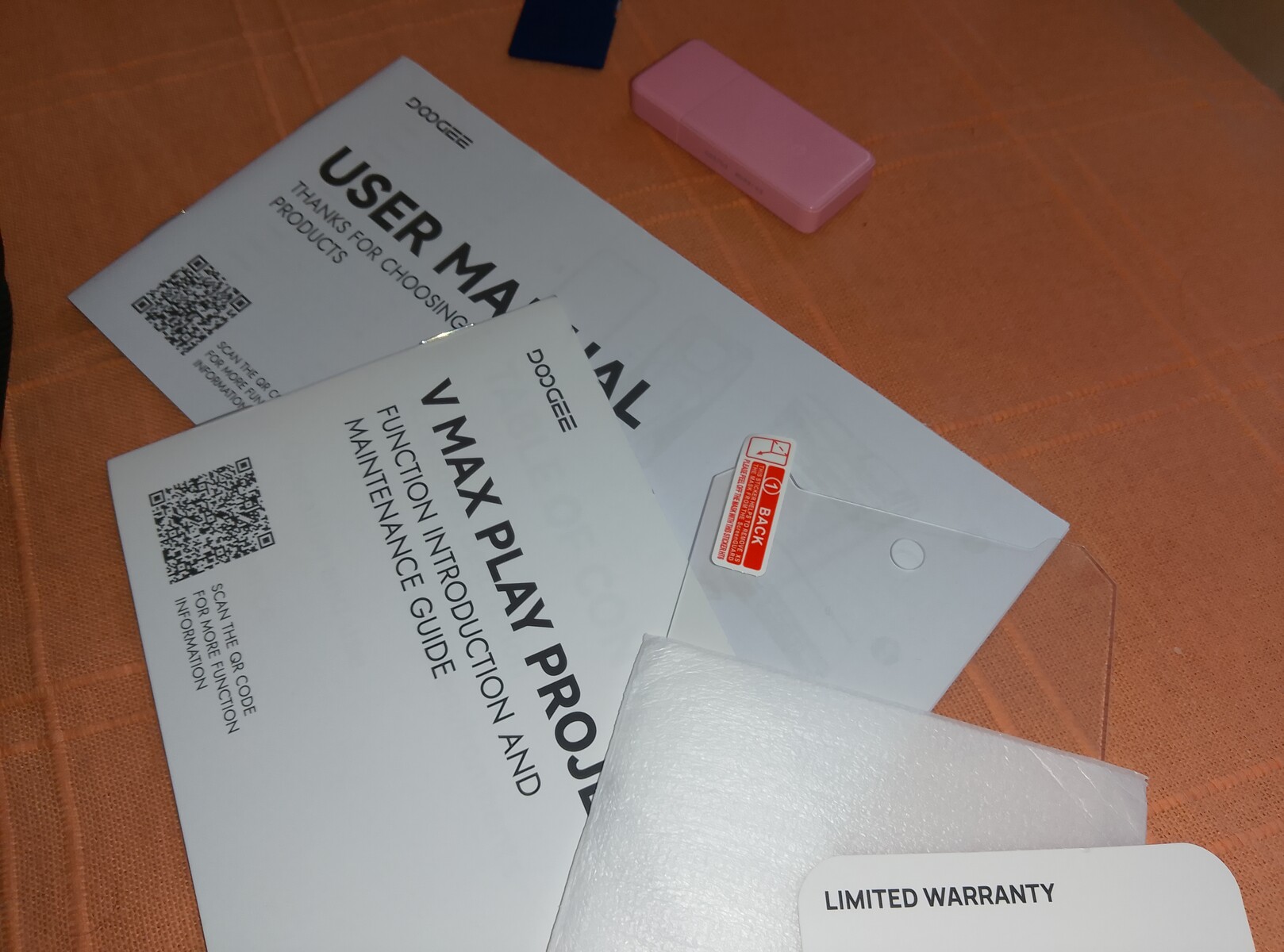 Förutom en vanlig kartong är det en svart resväska i plast som garanterar telefonens säkerhet på vägen till användaren. Förutom en V Max Play innehåller väskan en liten 45-W-laddare, en USB-C till USB-C-kabel, ett hårt skärmskydd, olika informations- och garantihäften och en hård skyddsväska slash telefonhållare - en stor plastbit som skyddar Doogee-telefonens baksida, botten, vänster och höger, med ett handtag på en av sidorna. Detta är basutbudet av godsaker; de som är redo att betala lite mer får också en liten Doogee-märkt Bluetooth-högtalare och ett stativ som förhoppningsvis gör det lite enklare att använda V Max Play som projektor.