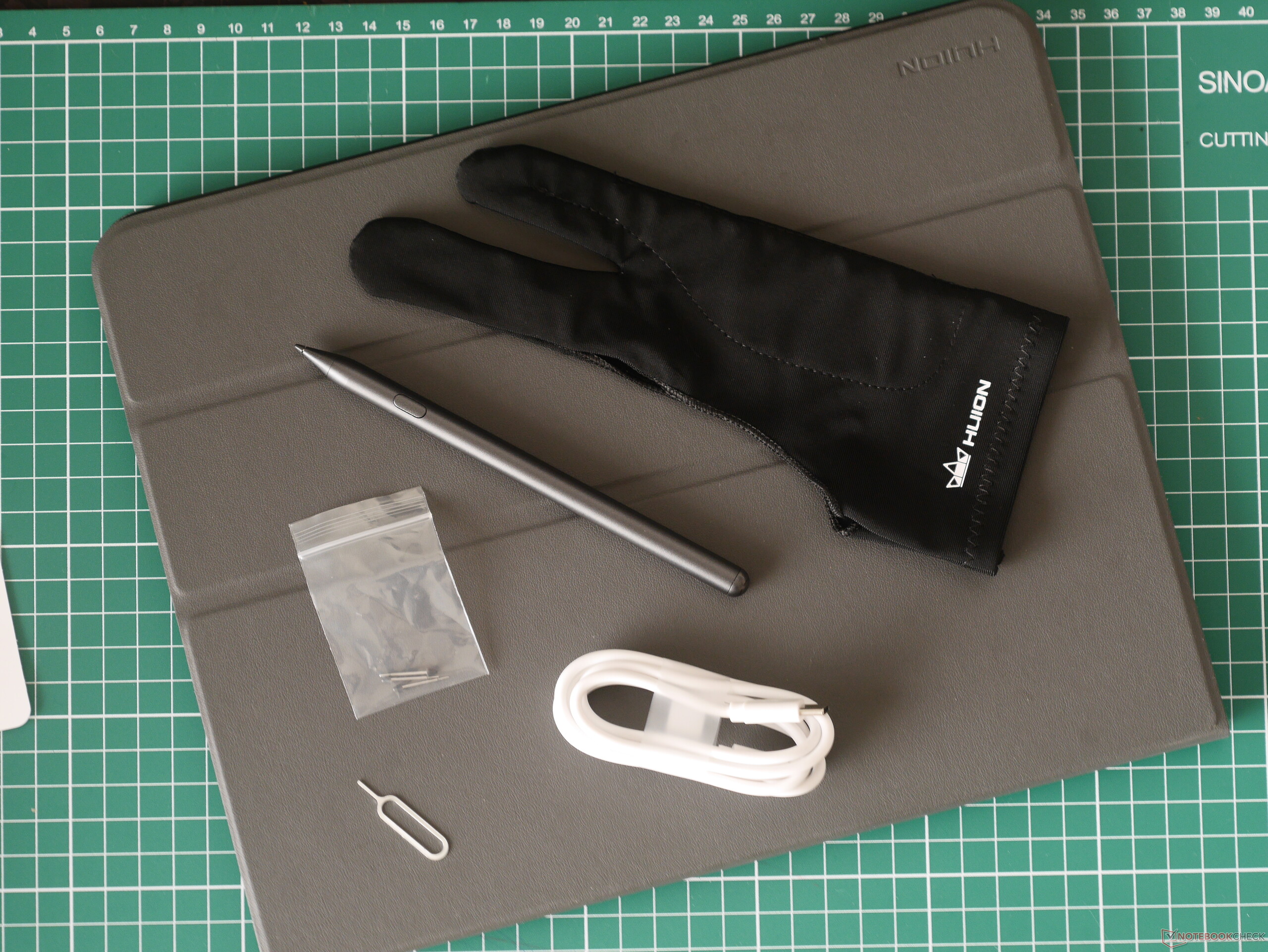 Förutom avsaknaden av en medföljande laddningsbricka är Huion Kamvas Slate 13:s tillbehörssats anständig. Den ambidextre rithandsken är tillräckligt stretchig för att passa en rad olika handstorlekar och minskar oavsiktliga beröringar.