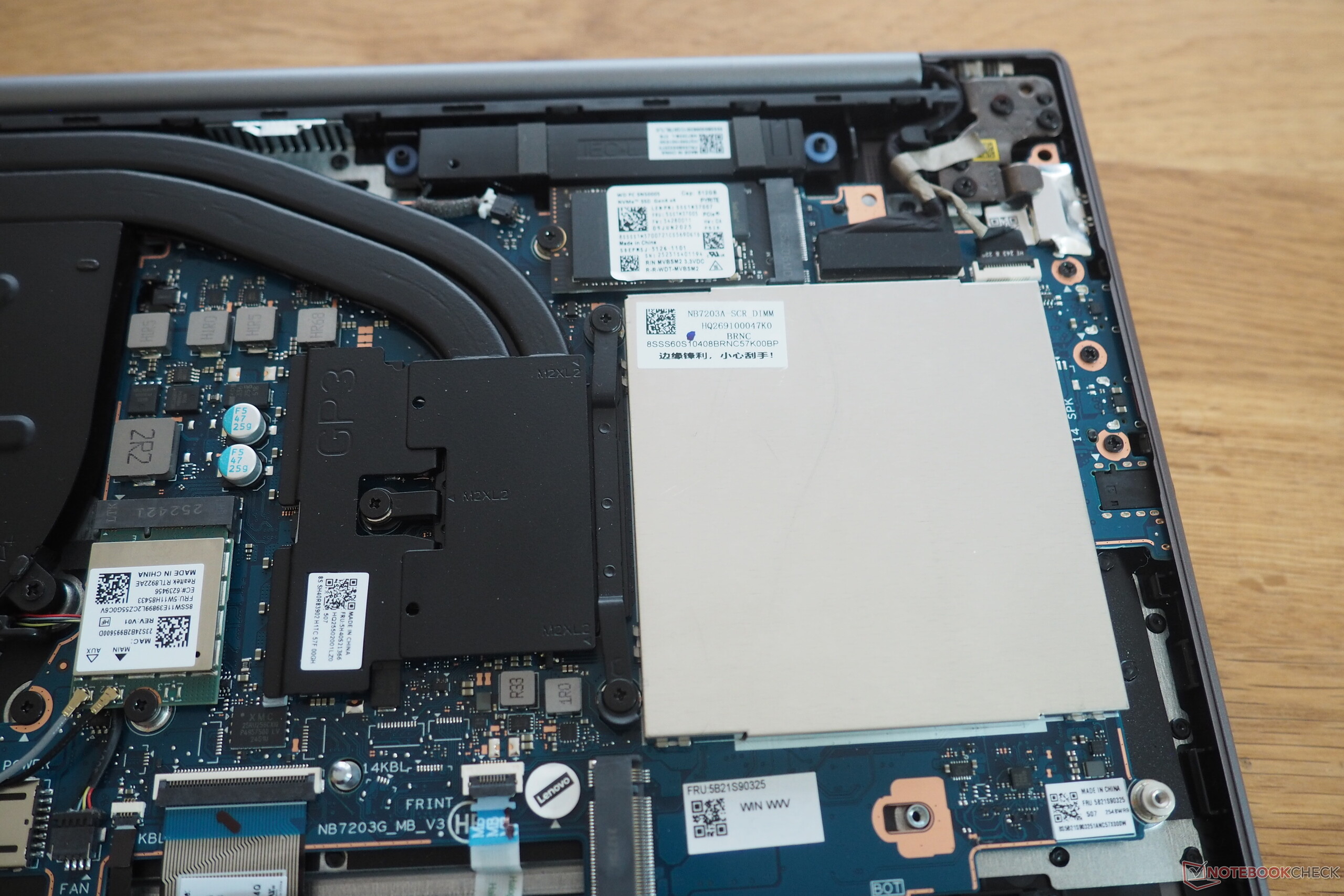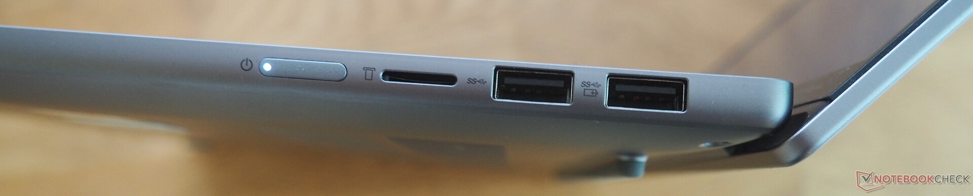 På vänster sida hittar du två USB-C 3.1 Gen 2-portar med DisplayPort 1.4 och PowerDelivery-stöd, samt en HDMI-utgång och ett kombinerat ljuduttag. På höger sida finns en relativt snabb microSD-kortläsare och två konventionella USB-A 3.0-portar. En Ethernet-port ingår inte, men den bärbara datorn har en mycket snabb Wi-Fi 7-modul. Webbkameran, som har en sekretesslucka, har en upplösning på endast 0,9 MP, men ger ändå en skarpare bild än många konkurrerande modeller. Bottenlocket är lätt att ta bort efter att ha lossat sex Torx-skruvar. På insidan hittar du två SO-DIMM-platser samt två M.2-platser. 2280-platsen är ledig, medan den installerade SSD-enheten sitter i den mindre 2242-platsen.