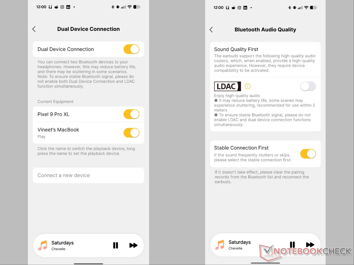 LDAC fungerar som förväntat, och vi märkte en något förbättrad ljudutgång när den parades ihop med Pixel 9 Pro XL och LDAC aktiverades i utvecklaralternativen. När LDAC är aktiverat kan inte anslutning med dubbla enheter användas. På tal om det, parning med två enheter - Pixel och en MacBook Air M4 - fungerade som annonserat, med öronsnäckorna som växlar till källan med aktivt ljud automatiskt. Vi märkte dock att efter att ha tagit ut öronsnäckorna ur fodralet och de automatiskt anslutit till båda enheterna, skickade inte uppspelning av musik på telefonen ljud till öronsnäckorna. När vi kopplade bort MacBook Air började ljudet att skickas från telefonen igen, vilket tyder på att de felaktigt detekterade ljudinmatning från MacBook Air trots att inget spelades. När de väl kopplats bort och återanslutits till MacBook Air fungerade de som de skulle. Men problemet återkommer ofta.