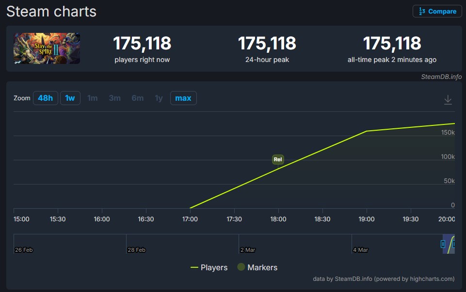 Enligt data från SteamDB nådde spelet över 175 000 samtidiga spelare på Steam bara några timmar efter lanseringen. Detta är en mycket stark start, särskilt för en tidig åtkomsttitel. Som jämförelse nådde originalet Slay the Spire ett toppspelarantal på 57 025 spelare för cirka tre månader sedan. Det betyder att uppföljaren redan har överträffat sin föregångares topp med nästan tre gånger inom bara några timmar efter lanseringen.