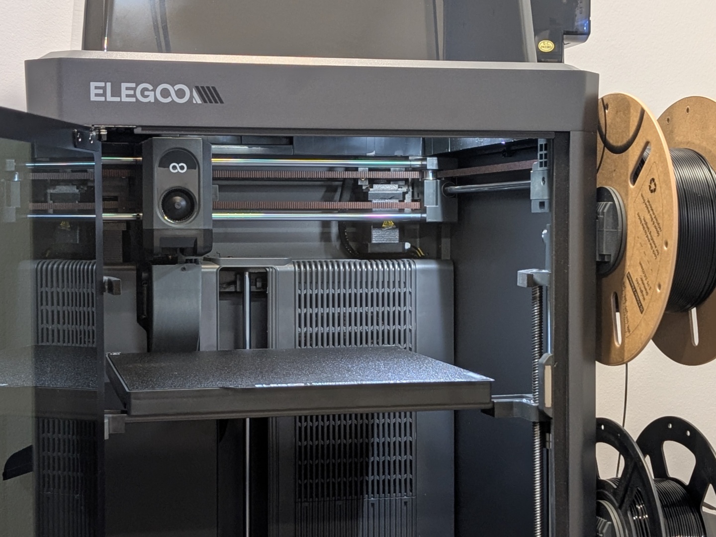 Canvas-systemet tillåter upp till fyra olika färger och, även om Elegoo inte rekommenderar det, även fyra olika filamenttyper. Detta gör det möjligt att skriva ut PLA-delar med PETG som stöd eller vice versa, samt olika kombinationer av kompatibla filament. Elegoo har också lagt till en RFID-sensor som fungerar utmärkt med sina egna RFID-kompatibla spolar. Placera spolen bredvid Canvas-systemet så känner det av färg och typ. Allt du behöver göra är att tilldela den en plats.