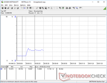 Strömförbrukningen när Asphalt 8 körs med maximal ljusstyrka är cirka 19 W, vilket återigen är högre än på de flesta andra Chromebooks. För ett mer extremt scenario kan vi mäta ett maximalt uttag på 69 W när CPU:n är 100 procent utnyttjad. Denna hastighet är dock endast tillfällig eftersom Turbo Boost-prestanda inte är obegränsad.