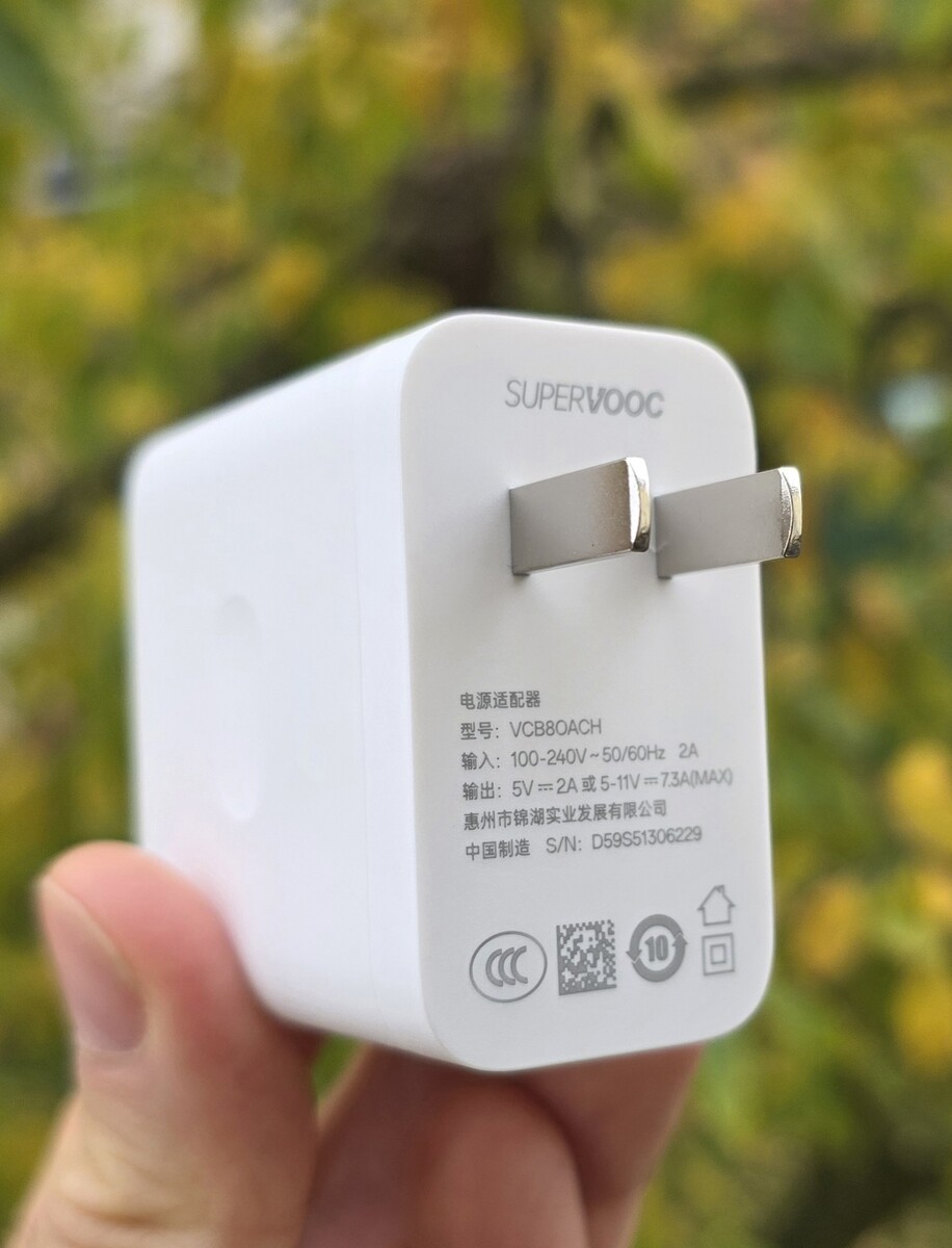 Den medföljande SuperVOOC-laddaren laddar flaggskeppssmartphonen med en topp på 80 watt (11V, 7,3A) och väger bara cirka 106 gram. Oppo är lite för "traditionell" när det gäller USB-porten, eftersom den bara använder Typ-A-kontakter, så logiskt nog har den medföljande USB-kabeln också bara en Typ-A-kontakt och inte den modernare USB-C till USB-C-kontakten. Eftersom allt färre bärbara datorer använder denna äldre standard är det på tiden att Oppo uppdaterar sina nätadaptrar.
