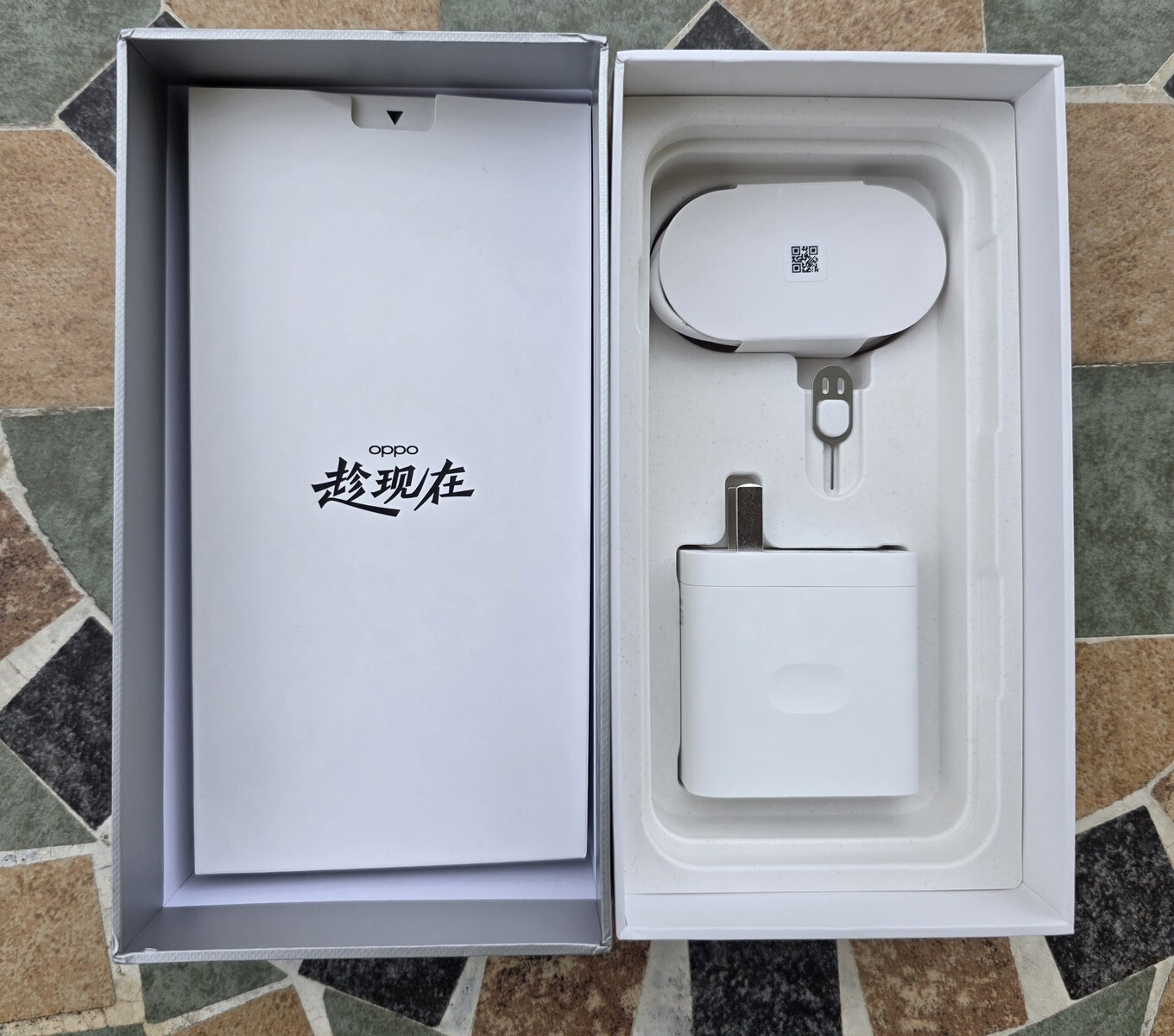Redan innan uppackningen märks det att lådan är mycket stor enligt dagens standard. Detta beror på snabbladdaren, som endast ingår i den kinesiska modellen av Find X9 Pro. Köpare av den internationella modellen måste använda en separat laddare.
