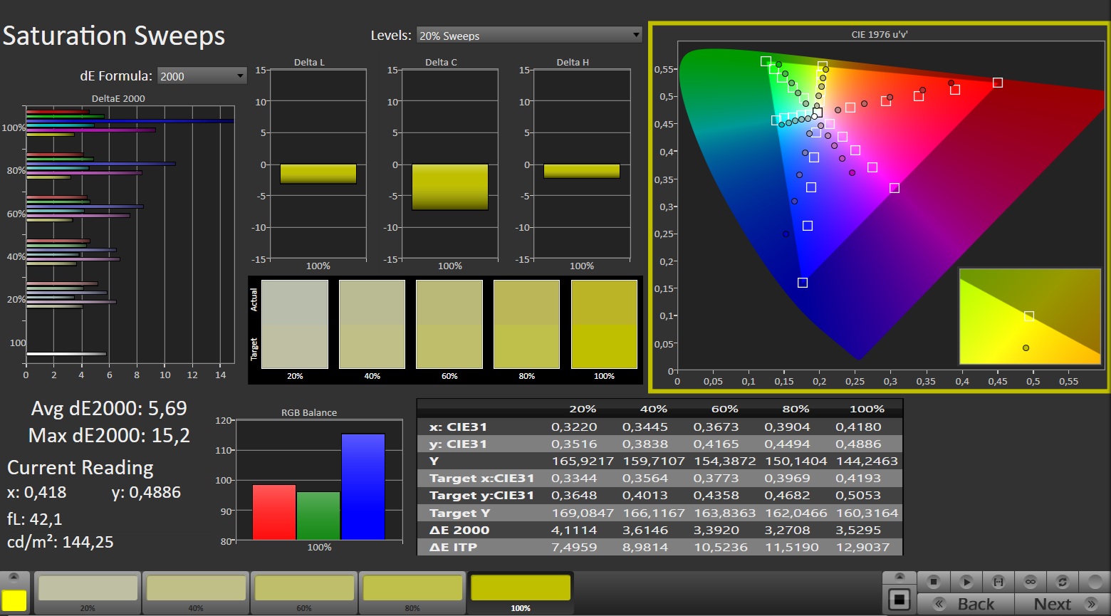 I fabriksutförandet är panelen i allmänhet inte färgkorrekt på grund av att den har en stark blå nyans, vilket dock kan korrigeras genom kalibrering.