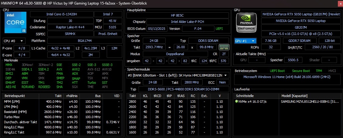 | HP Victus 15-fa2160ng i5-13420H, GeForce RTX 5050 Laptop | HP Victus 15-fa1057ng i5-13500H, GeForce RTX 4050 Laptop GPU | Medion Erazer Scout 17 E1 MD62758 Core 5 210H, GeForce RTX 5050 Laptop | Lenovo LOQ 15AHP10 R7 250, GeForce RTX 5060 Laptop | HP Omen 16-ap0091ng R9 8940HX, GeForce RTX 5060 Laptop | Genomsnitt av klass Gaming | |