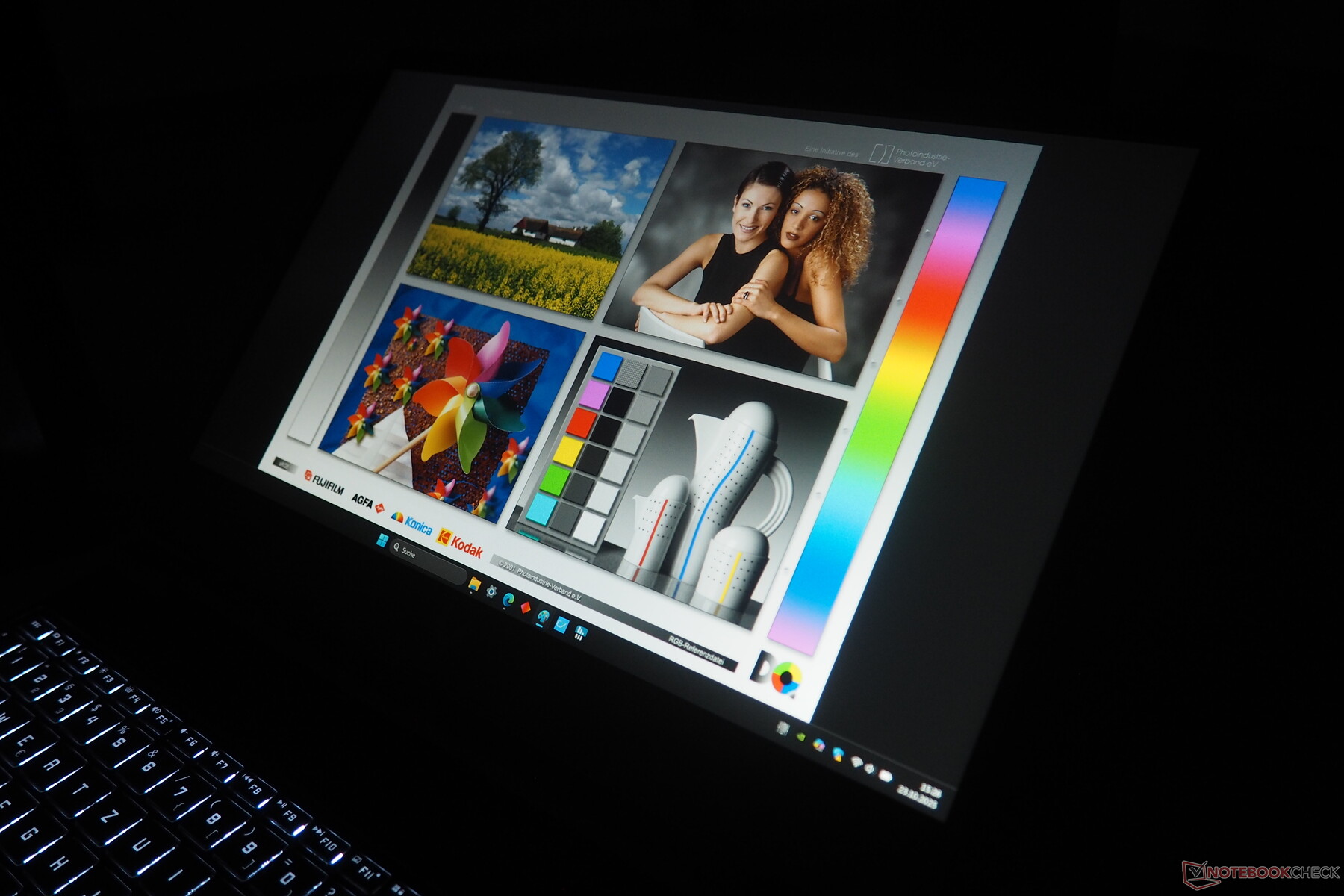 Förutsatt att du inte tar med dig den bärbara datorn ut eller in i solen är resten av resultaten solida. Detta börjar med en svartnivå på 0,26 cd/m², vilket i kombination med en ljusstyrka på cirka 300 cd/m² resulterar i ett IPS-typiskt kontrastförhållande på mer än 1 200:1. Betraktningsvinklar och svarstider är också anständiga.