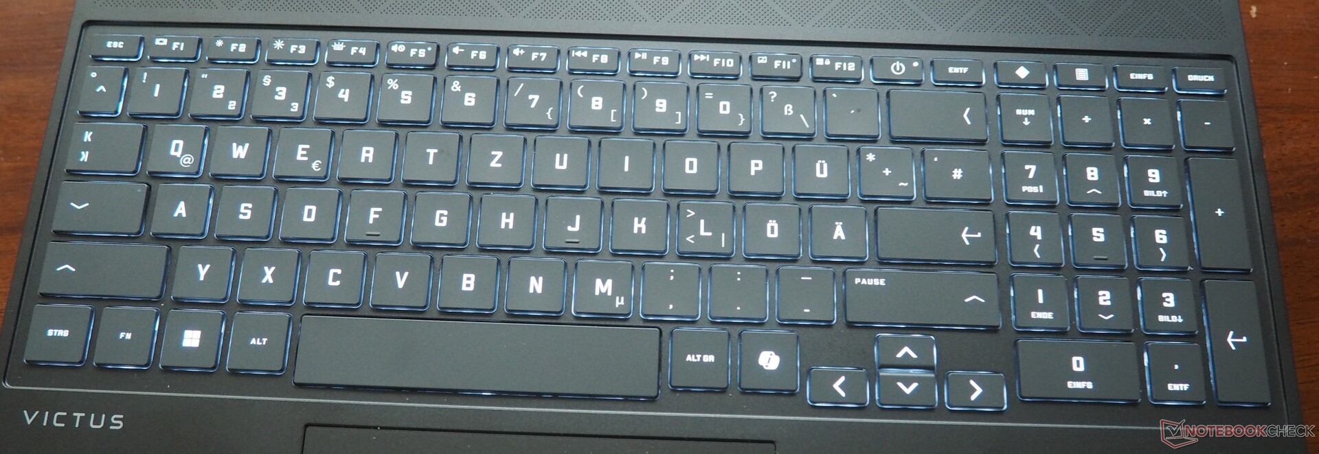 Inmatningsenheterna är relativt bra, utan att inspirera entusiasm. Tangentbordet använder hela bredden på höljet och har en numerisk knappsats i full storlek och vit bakgrundsbelysning i en nivå. Vi skulle beskriva layouten som en aning förvirrande - särskilt när det gäller det övre högra hörnet och strömknappens position, samt tangenterna "Insert", "Print Screen" och "Delete". Vissa användare kanske också längtar efter större pilar.