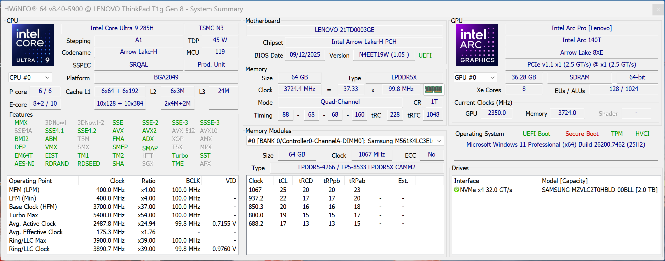 Den övergripande komponentprestandan är stark, även om grafikkortet kunde ha varit lite snabbare. Bland konkurrenterna sticker ThinkPad T1g Gen 8 ut genom att erbjuda RAM-minne som kan bytas ut av användaren, två snabba PCIe 5.0 M.2-platser och Thunderbolt 5-stöd. Nackdelen är att vissa affärsfokuserade funktioner saknas, till exempel en SmartCard-läsare eller ett 5G-modem.
